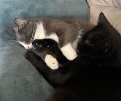 Hello SCARS, Jack has been with me for about two months. It hurts my heart some days to know he was born and survived a year outside. I am so blessed that we found each other. Here is a photo of him and his brother from another mother, Alfie. Cheers, Wynita C.