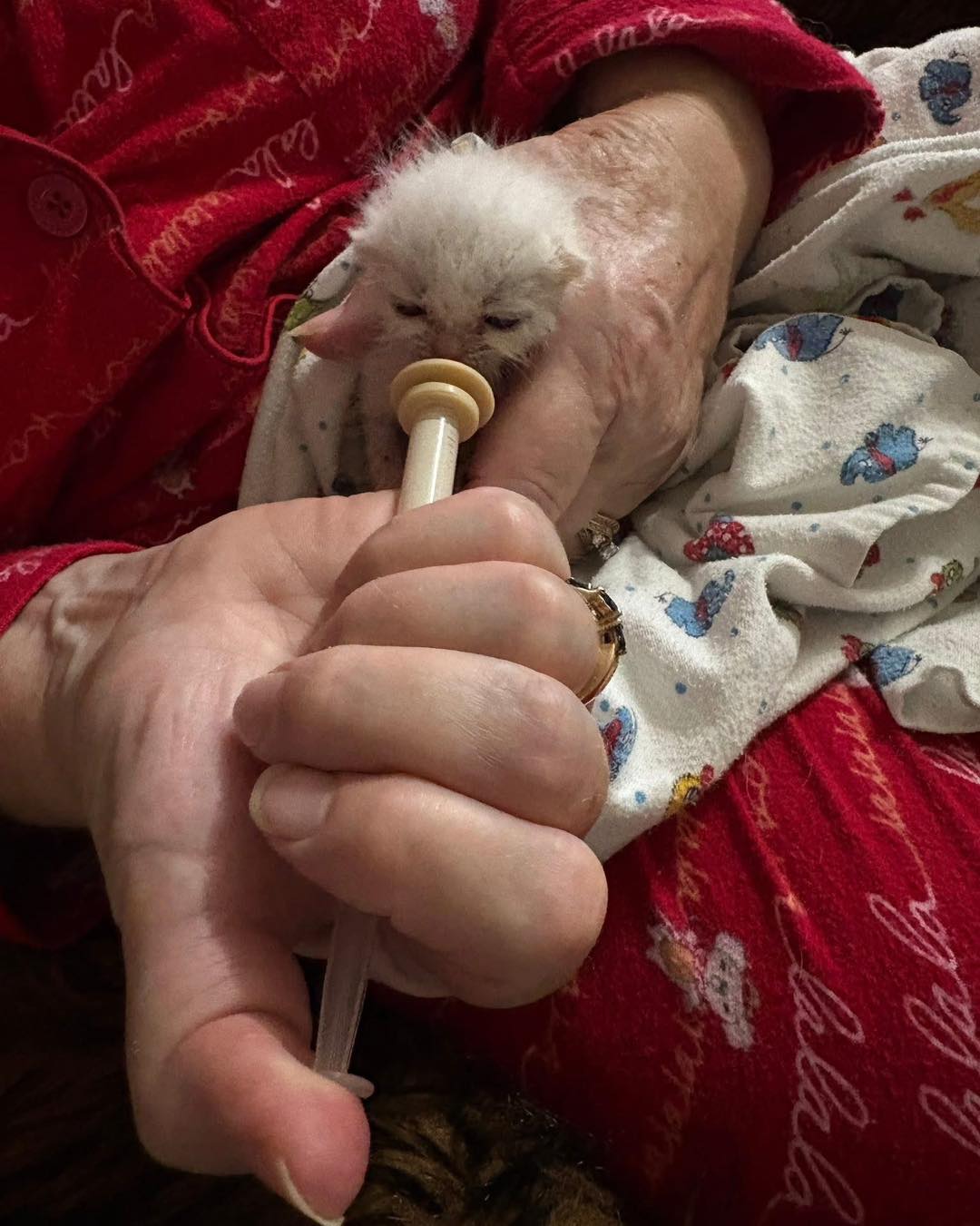 The smallest weighs only 137 grams, despite being fed every two hours, day and night. Patsys kitten, the larger of the two, weighs 200 grams – a milestone we celebrated together.