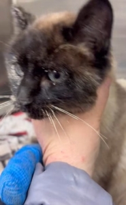 — Update on Lily – She’s missing most of her tail and one ear but she is literally the sweetest cat just trying to get snuggles. Because she was found starving, she’s a prime candidate for feeding syndrome so she is being fed itty-bitty amounts at a time until she can recover.