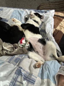 Coming from that batch of eight or nine collies, you might not even recognize me. Who knew Mom had canine pheromones for me when I got home. After only a week and a half, I was mostly potty trained. Mom and Dad still have to figure out my signal for going out, but I don’t pee in the house anymore. I have great fun in the 2 feet of snow we’ve got here and I play around with the bestest best uncle big brother named Ryder. I can jump all over him and he won’t say anything. I’ve got myself a collar with the most important piece of jewellery ever. It has my very own name and Mom’s phone number on it. I have another collar to tell me where the electric fence is. I have lots of room to play and an uncle big brother to show me where home is in case I get lost. I got the sit thing down pat and I follow Mommy around like a puppy. I even let her put the leash on but the leading thing is a work in progress. I will come to her with the leash but only if she gets down on her knees and has treats.