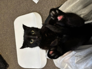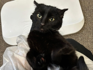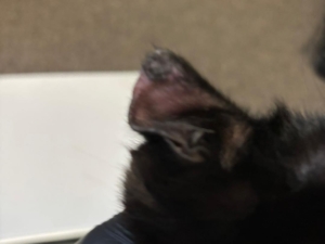 Raven was found on the side of a road on a cold day. She’s a female, smaller of the black two with white spot on chest and tummy. This poor girl had frostbite on her ears and pads.
