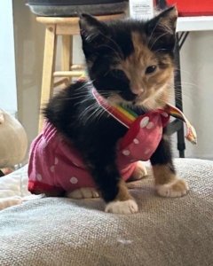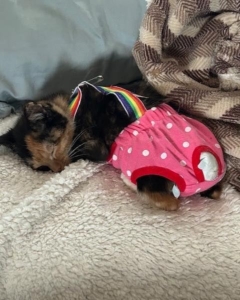 Thumbalina is a beautiful fun loving kitten who runs and plays with the other fosters. She is adorable and rocks her diapers like a movie star. Due to her special needs and care she is not adoptable and as there is no cure she will be like this her entire life.