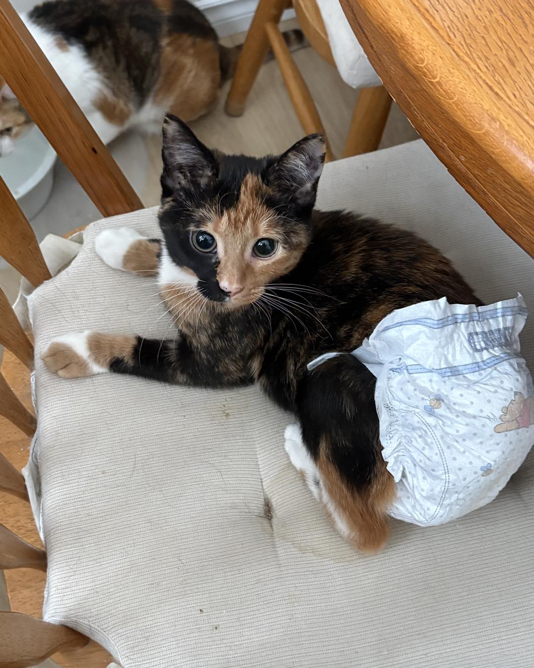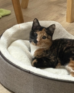 Thumbalina is a Manx kitten who has Manx syndrome. What is that you ask? Manx syndrome is a gene mutation in a Manx kitten. It shortens the spine too much and causes a number of health defects. Thumbalina is one of those kittens. She has fecal incontinence and urinary incontinence and a wobbly gait when she walks. She is bathed twice a day and wears a diaper during the day which is changed frequently. She also has a special diaper cream on her butt every time she has a diaper change to keep her drier so she doesn’t get UTIs. She is susceptible to UTI as she is always dribbling. During the night she is kept in her own pen without her diaper on so air can circulate around her and help keeping her from a UTI. She is on a urinary diet to help her as well. Thumbalina foster mom is learning to manually express her bowel and bladder to help her. She is also given restoralax twice a day to soften her stool and help prevent mega colon. When foster parents will be gone for a few hours she is put back in her pen diaper free. The bedding in her pen is changed 3 or more times during the day depending on how much time she spends in her pen.