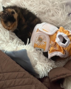 Another medical emergency. This is Thumbalina, she has some bladder problems because of what has happened to her tail. She hops like a bunny because the leg is not strong enough to hold her, and her spinal issues are severe. She is a cute lively little kitten… we hope she can recover.