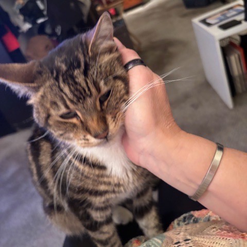 Hi there! I’m a friendly, easygoing guy who’s been around the block a few times — and I’ve still got plenty of love (and purrs) to give. I’m living with advanced kidney disease, which means I get some special food and medication every day. Don’t worry though — I’m doing really well and feeling good! My humans keep a close eye on me, and I make sure to thank them with headbutts and slow blinks.