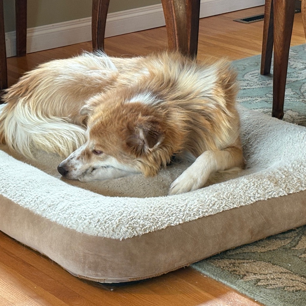 I’ve learned I like routine and catch on quickly, I love going for walks and keeping up with the pee mail, foster mom says I’m so gentle on the leash. People passing, fast bikes and noisy cars don’t phase me. I’ve discovered some changes are not so big, like I can still wander in the house, from my own bedroom aka crate, to a big cushy bed close to my person to the entry way where I get to see all the action. I do my potty business outside but I rely on you to make the schedule.