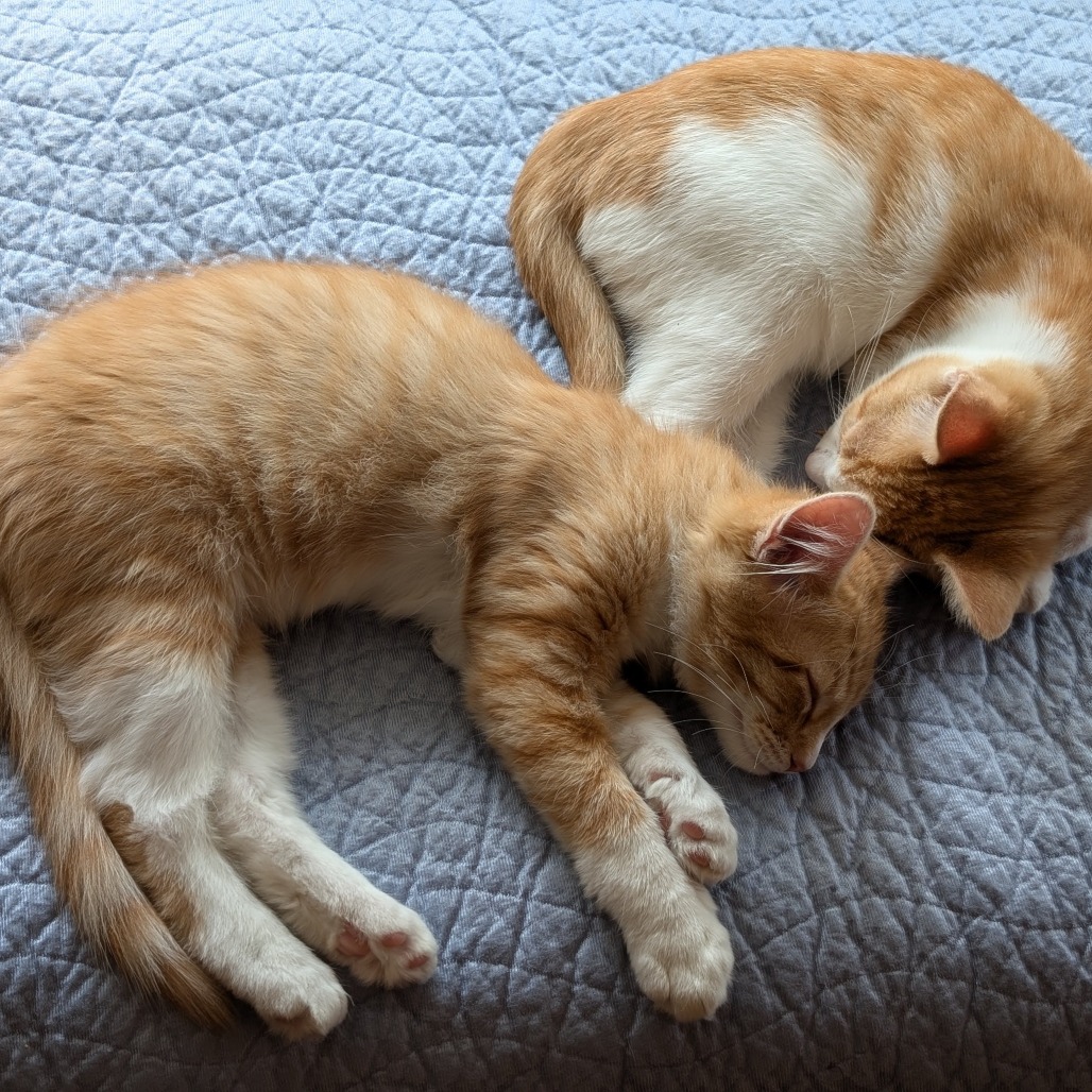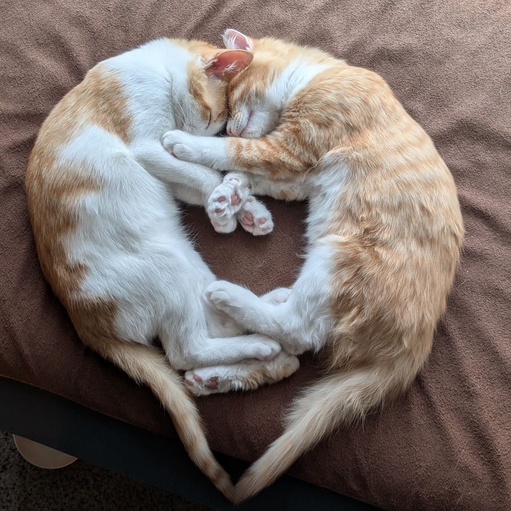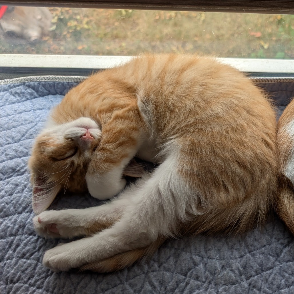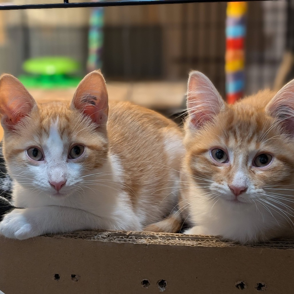 My name is Sun and I am the sweetest guy.  I get along with everyone, kids, cats and dogs.  I spend most of my day curled up with my brother Meteor and we would do best adopted together. After a good sleep we like to wrestle and play. I am happy to come to you for some cuddles and start to purr pretty quickly.  Once I get to know you I will likely be sleeping at your feet at night.  I’m very curious and love to explore.  I am also neat and tidy with my litter.  I’ve tried a harness and felt pretty comfortable in it.  If you are looking for a lovable pair of kittens Meteor and I are your guys