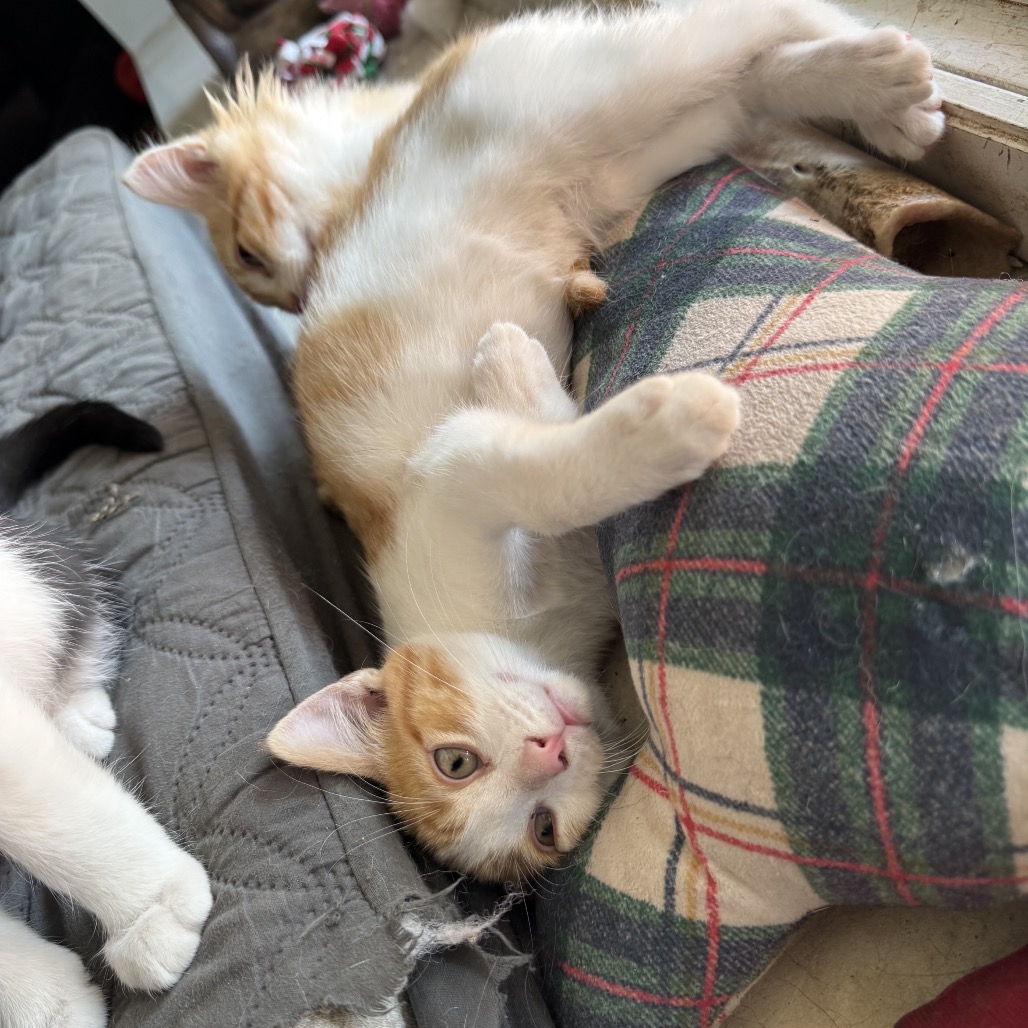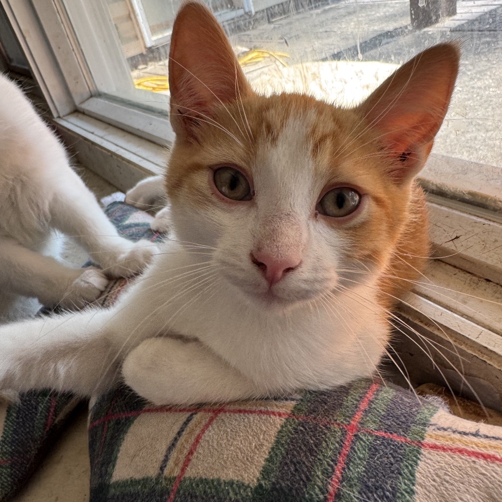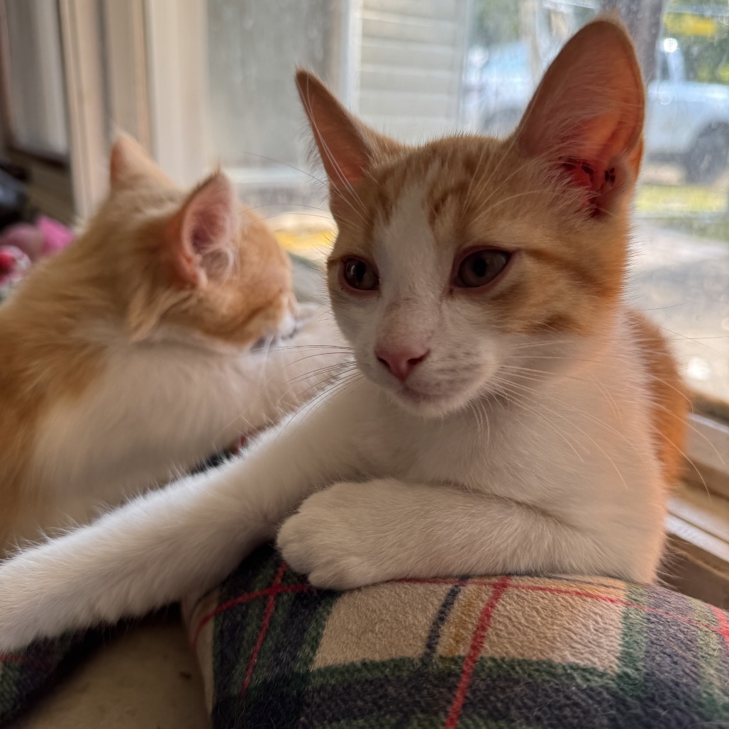My name is Meteor and I want to orbit around you! I love to be around people and other animals (I’ve been caught cuddling with the big dog at my foster home). I spend most of my day curled up with my brother Sun and we would do best adopted together. After a good sleep we like to wrestle and play. I am happy to come to you for some cuddles and start to purr pretty quickly. Once I get to know you I will likely curl into one of your nooks to sleep. My I’m very curious and love to explore but I’m also happy to just chill wherever you are. I am also neat and tidy with my litter. I’ve tried a harness and felt pretty comfortable in it. If you are looking for a lovable pair of kittens Sun and I are your guys
