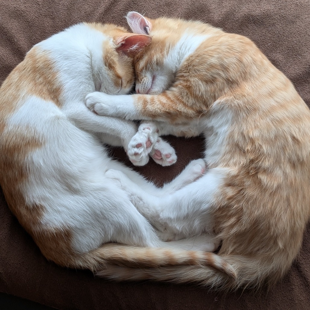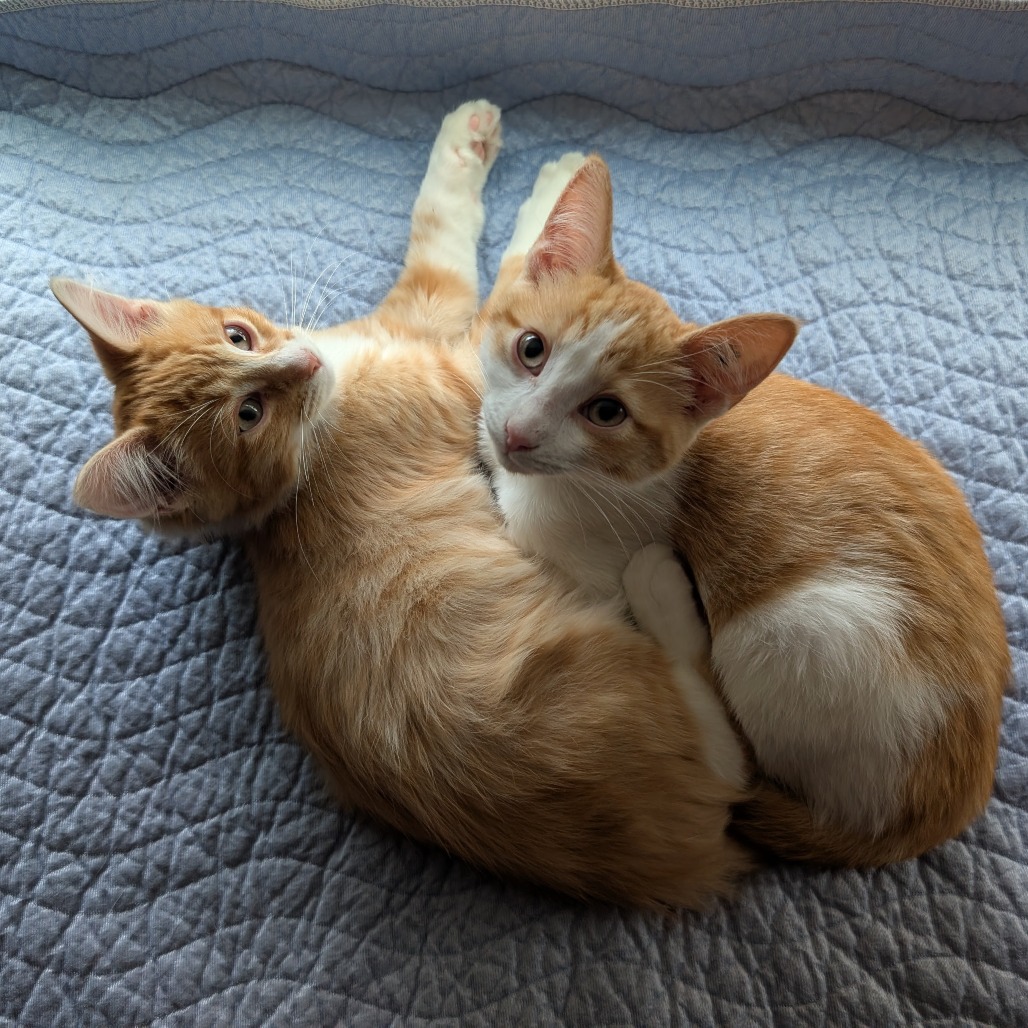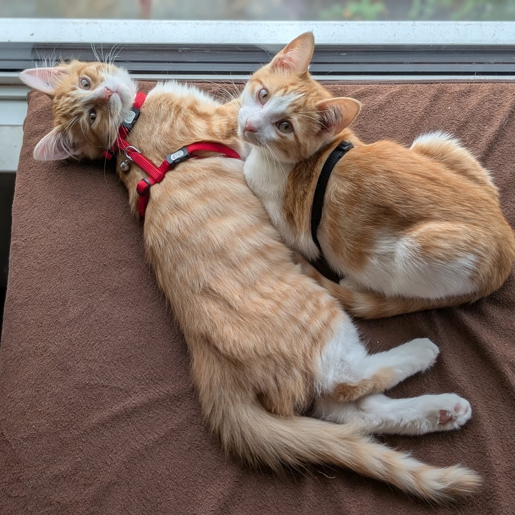 My name is Meteor and I want to orbit around you! I love to be around people and other animals (I’ve been caught cuddling with the big dog at my foster home). I spend most of my day curled up with my brother Sun and we would do best adopted together. After a good sleep we like to wrestle and play. I am happy to come to you for some cuddles and start to purr pretty quickly. Once I get to know you I will likely curl into one of your nooks to sleep. My I’m very curious and love to explore but I’m also happy to just chill wherever you are. I am also neat and tidy with my litter. I’ve tried a harness and felt pretty comfortable in it. If you are looking for a lovable pair of kittens Sun and I are your guys