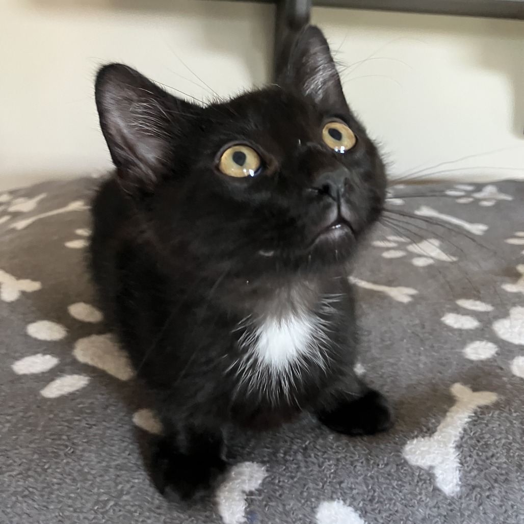 My name is Corvus. I am a beautiful long and lean black beauty. I am very affectionate and purr and purr. I am a bit of a celebrity in the feline world as I did a photo shoot with the Fort Sask Fire Dept. I will be in their new upcoming calendar in support of Scars. I also was in a video for Homes Alive. You can find that on their website. I am great with all the new kittens that come into my foster home. I am an all around great kitten. I am a little social butterfly and I love wand toys. I can jump super high. If you meet me, you will fall in love.