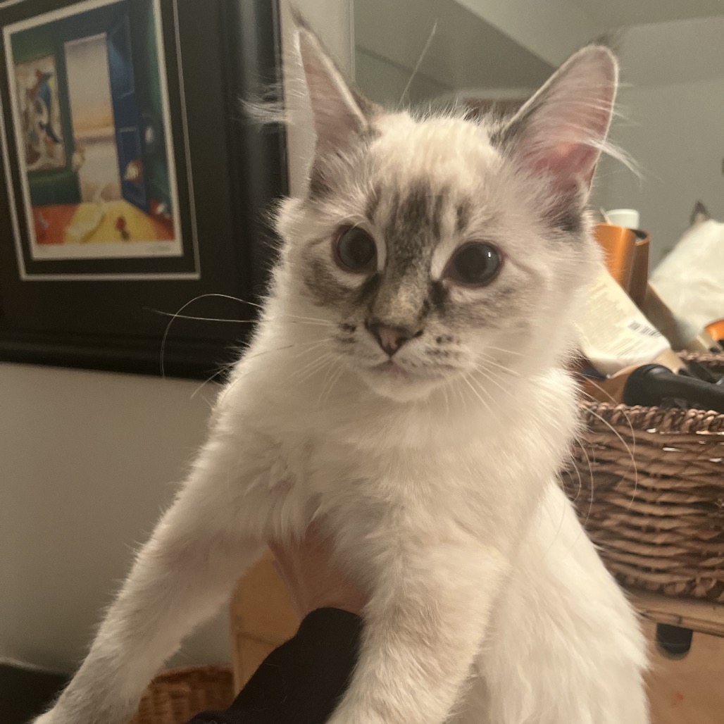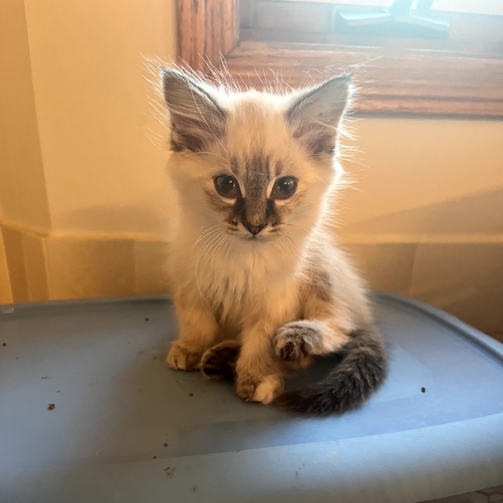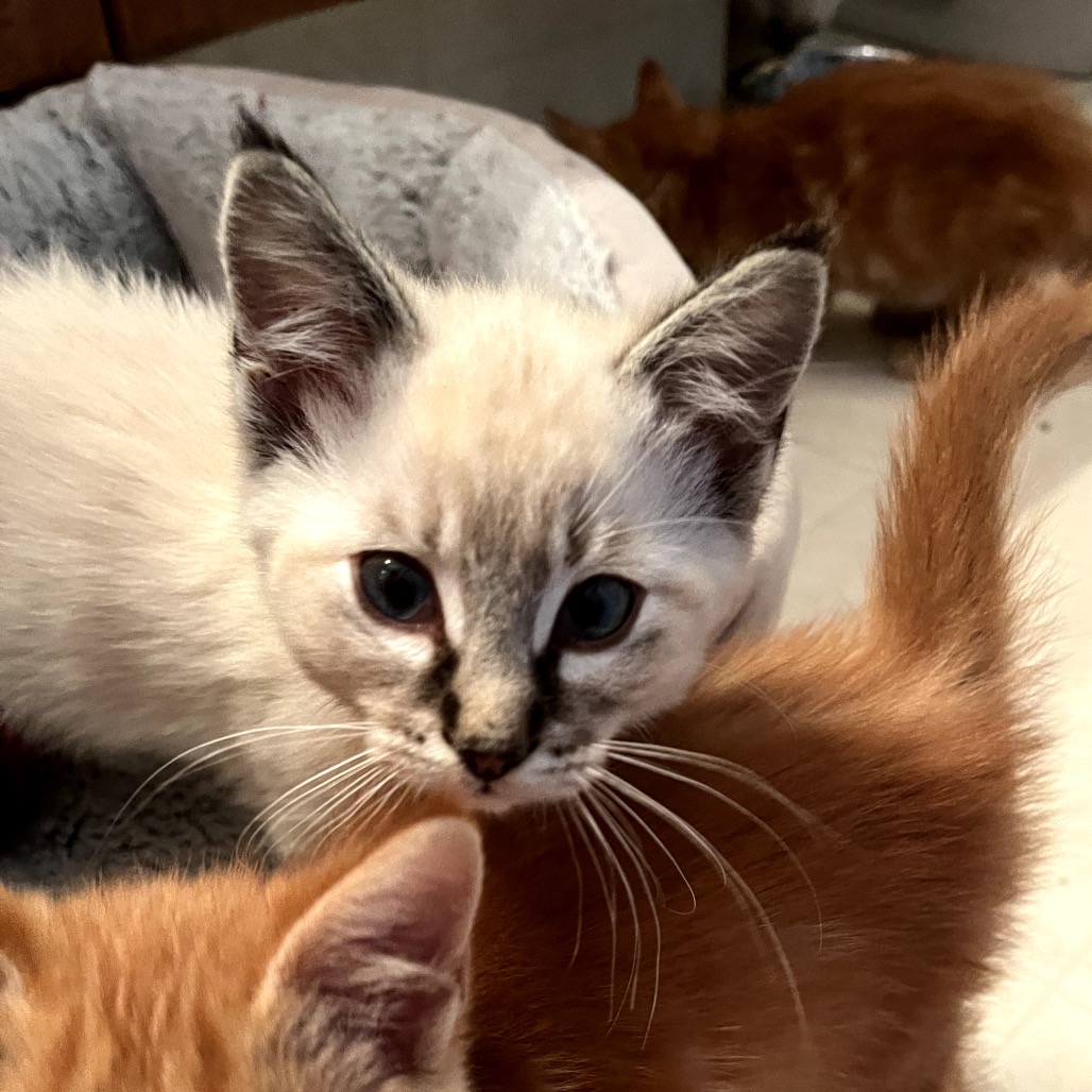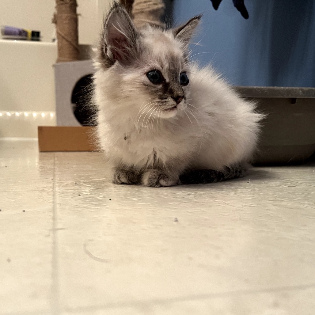 Hello future family! Thank you for considering adoption as a way to grow your heart and home. I am an ADORABLE blue-eyed white fluffy girl. I was pretty tiny and shy when I came into care. My siblings and I were living outside without our mom when we were rescued by SCARS. I was underweight and pretty fearful of humans. Shortly after coming into care, we were diagnosed with Feline Coronavirus. No, it's not the same as the human Covid 19 but it did involve a lot of litter clean up! And some accidents on the floor too, sorry foster mom. Thankfully we are now using the litter box like we are supposed to. Did you know up to 80-90% of felines are exposed to FeCov? It took our foster family a lot of hard work to get us to being healthy baby cats! I have warmed to my surroundings and my foster family but I do remain the most cautious of my crew. I tend to prefer to snooze in my little cave when my brothers and sister get rowdy. I like a cuddle but I'm still learning to trust so it won't be too long when we first meet. Come and meet my fluffy self- you'll fall in love.
