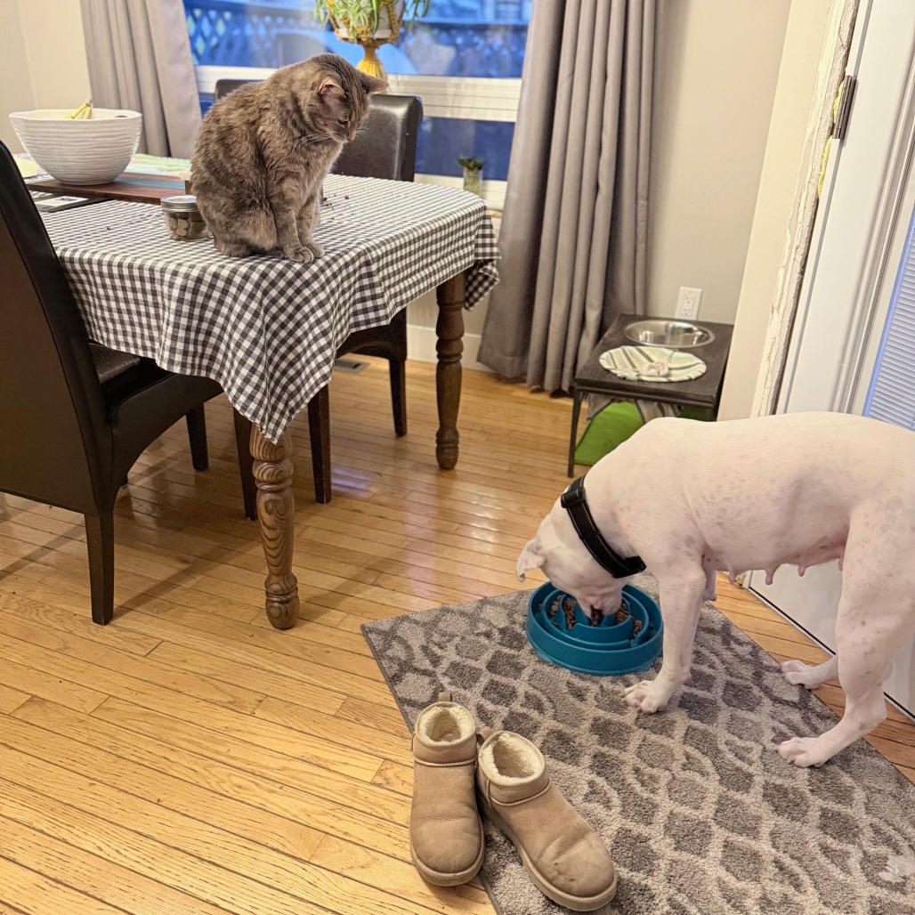 She does have a little bit of separation anxiety when you first leave, but after a quick tour seems to relax and goes and lays down which is why someone home often would be great.