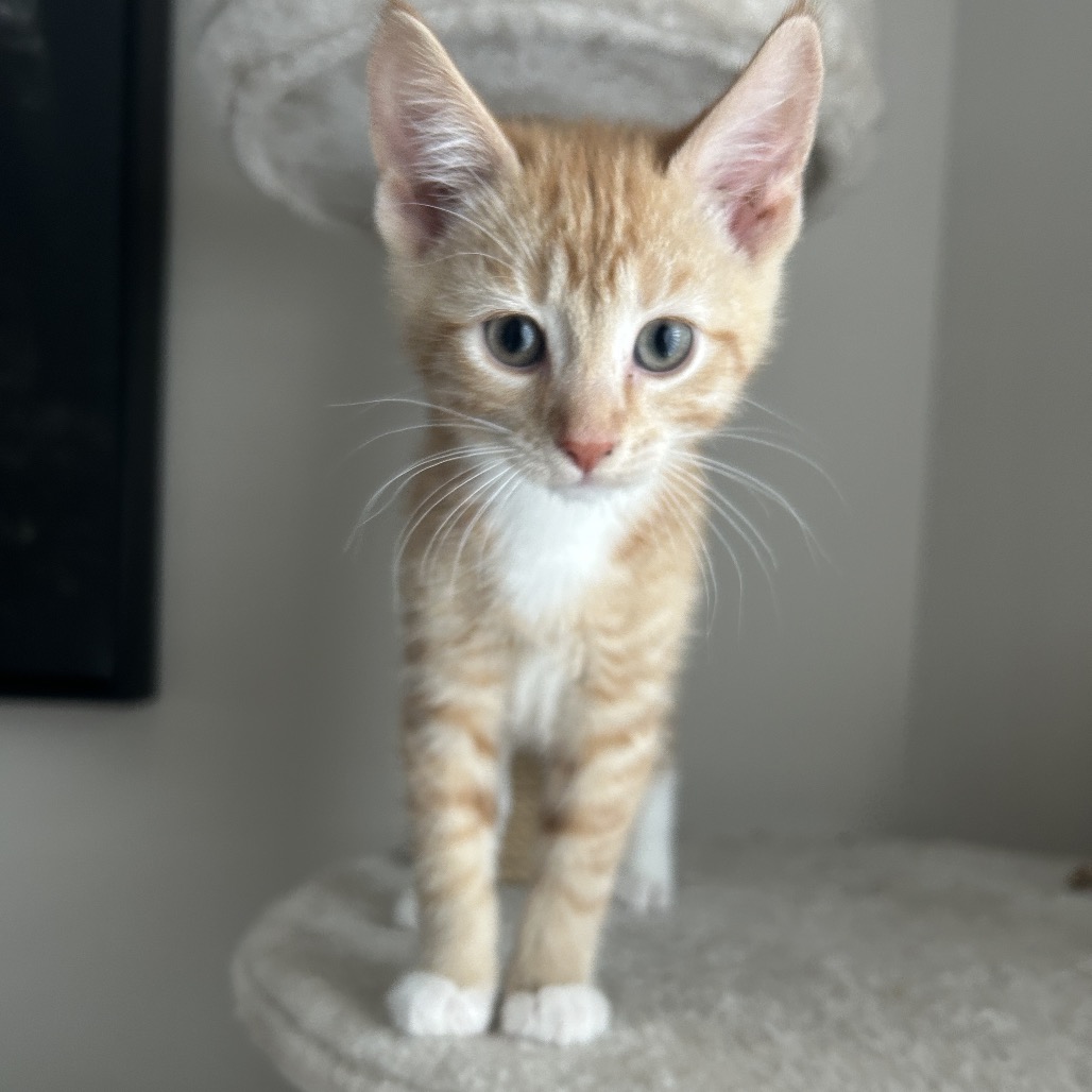 I’m a classic ginger boy—full of energy, curiosity, and confidence. I love exploring every corner of my space, chasing toys, and playing with my siblings. If there’s something new to investigate, you can bet I’ll be the first one there! Even with all my kitten antics, I’m a very friendly guy who enjoys cuddles, pets, and spending time with my people.