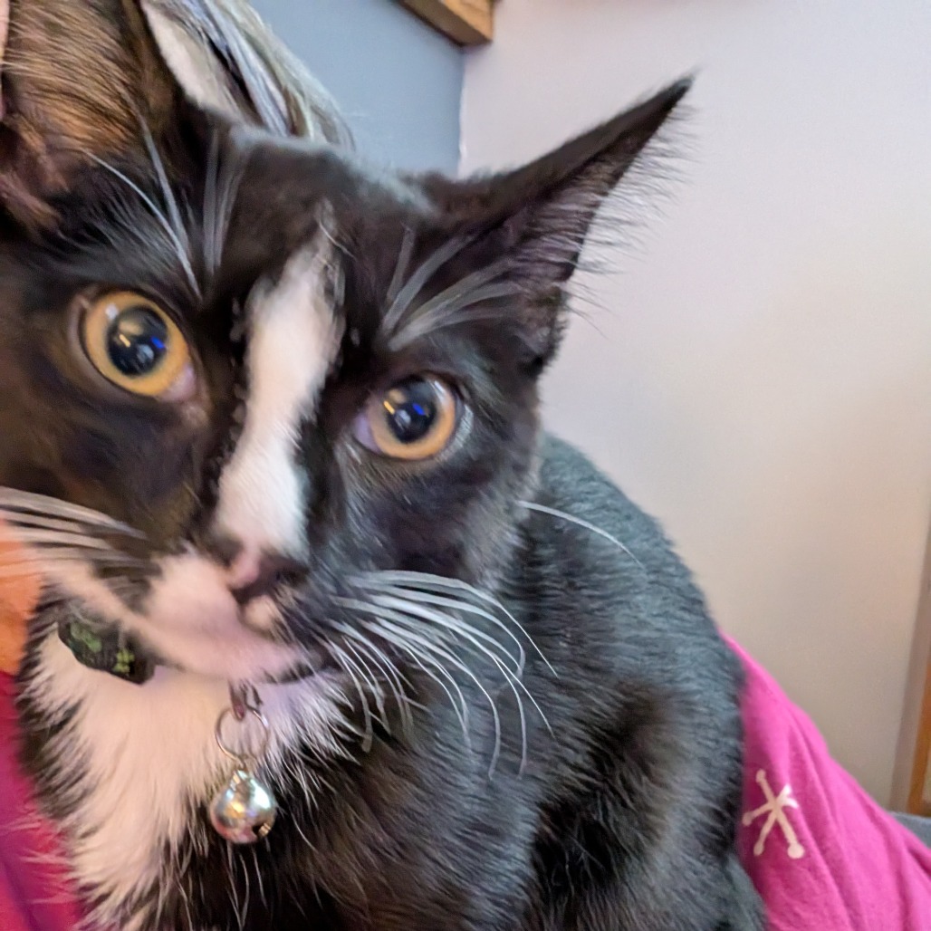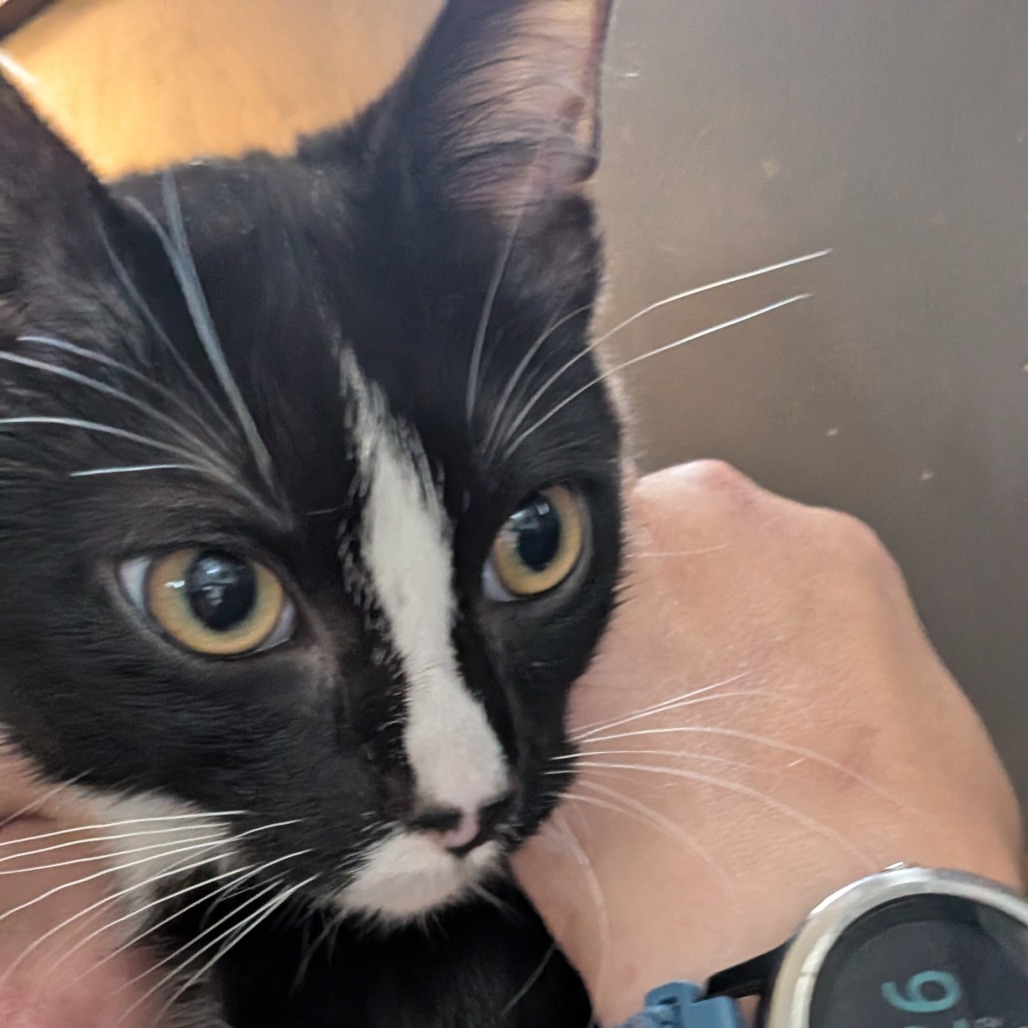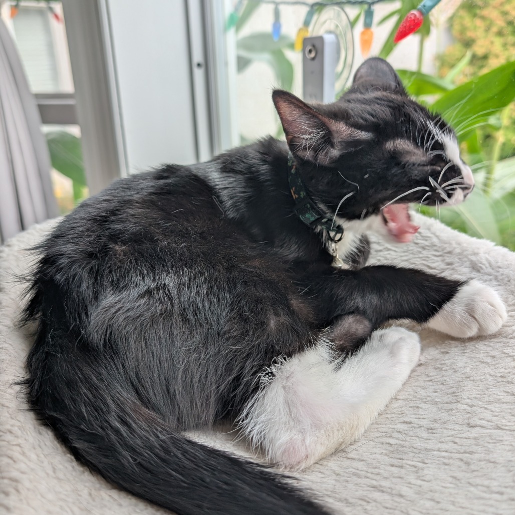 I really like standing on Foster Mom’s shoulder, with my ribs against her ear so she can hear how loud I’m purring. And I climb up on Foster dad when he’s in his big chair, so that I can curl up on his chest and get scratches.