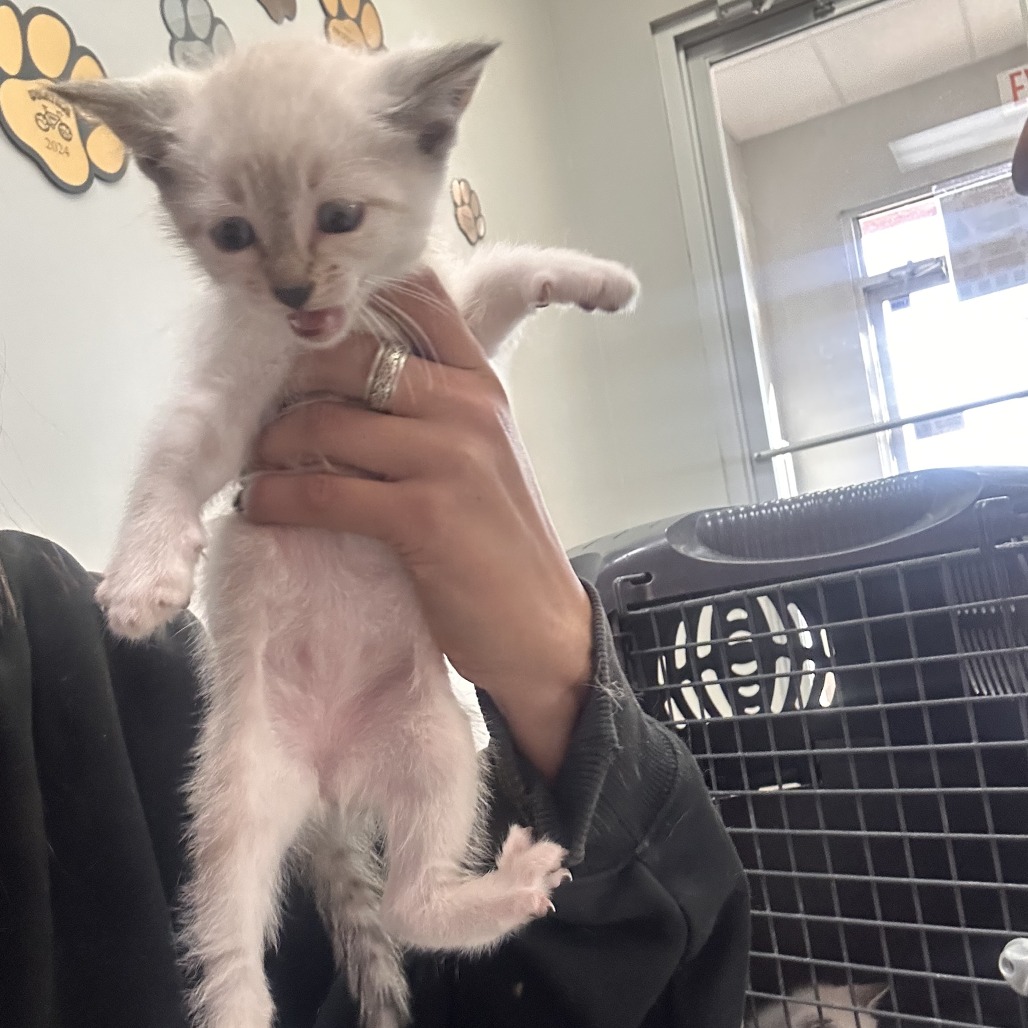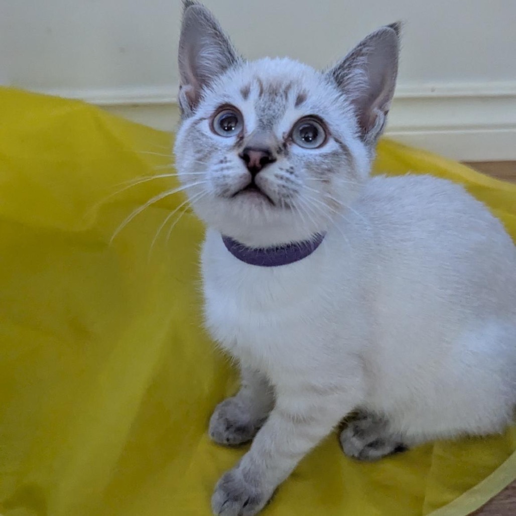 Hi! I'm April Ludgate. Unlike my namesake, I'm not afraid to show how much I love you! I love climbing all over my foster mom and purring up a storm. Like all kittens, I also love to play. I run and jump and goof off with my siblings until we're all tired and nap together. I'm a super happy, spunky little gal. I'd love to be adopted with one of my siblings or into a home with another young, playful cat. I also don't mind my big dog foster brother, so it's fine if you have dogs. As long as you have the time to give me plenty of attention and playtime, I'll be happy! Please consider adopting me!