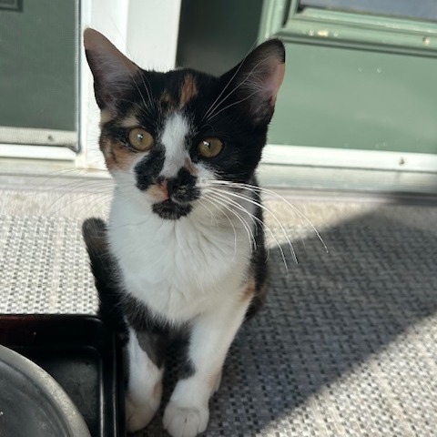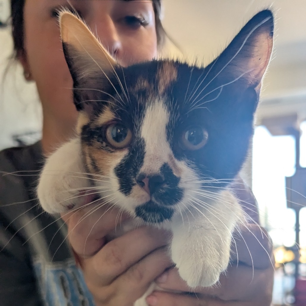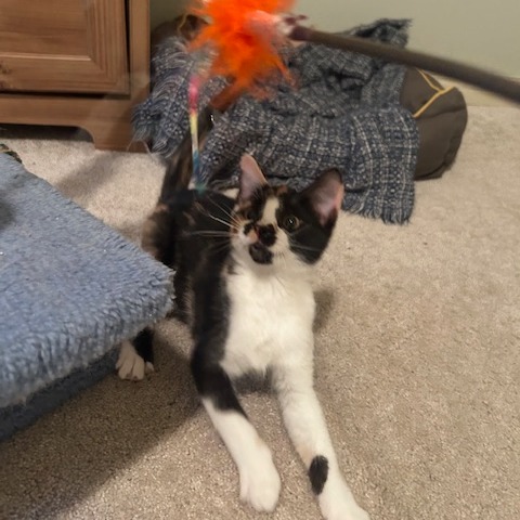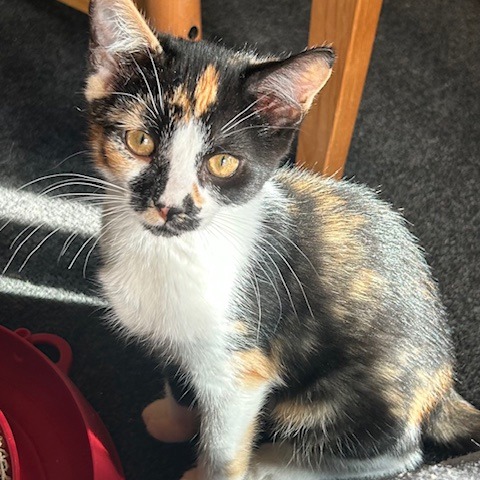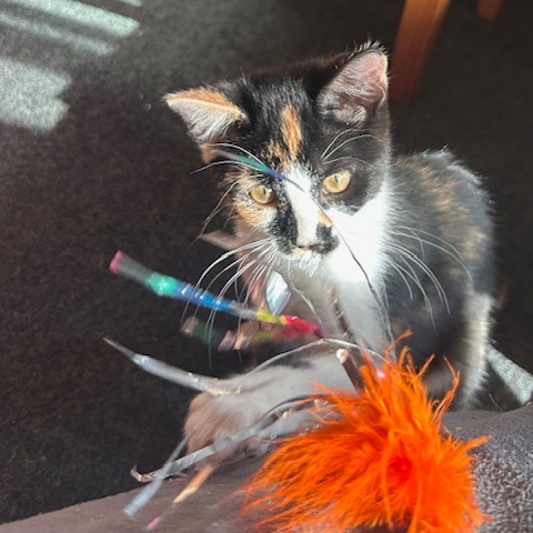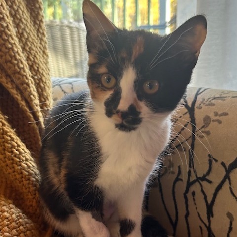 Hello! I'm Medusa a beautiful calico kitten with cool, unique markings that make me stand out. I'm playful, energetic, and I love to chase my siblings around the house. My favorite toy is a feather wand— l leap, pounce, and show off my moves every chance I get! I can also gets pretty vocal when it’s mealtime, so you’ll definitely know when it’s time to eat. I'm very social and enjoy being around people. After I'm done playing, I absolutely love to curl up on your lap for a cozy nap. If I don't say so myself I'm the perfect mix of fun and cuddly. I get along well with other cats and I'm comfortable around dogs too. If you’re looking for a sweet, playful, and affectionate kitten, I might be the perfect match for you!
