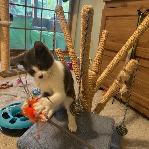 He’s wonderfully social and gets along great with other cats. He’s also comfortable around dogs, making him a great fit for a multi-pet household. Whether he's wrestling with his sisters, batting around a toy, or curling up for a nap nearby, Zeus brings a joyful energy wherever he goes.