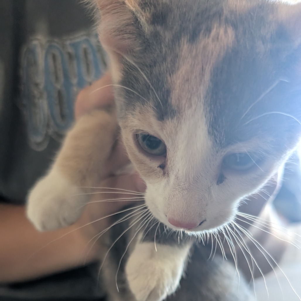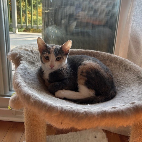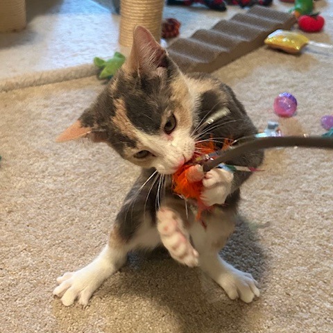 Hello, meet Aphrodite, a soft and sweet little light calico with a playful spirit and a gentle heart. She may be the shyest of her litter, but once the feather wand toy comes out, her confidence shines! This girl loves to play — especially when her siblings are involved — and she’ll happily chase, pounce, and tumble with the best of them.