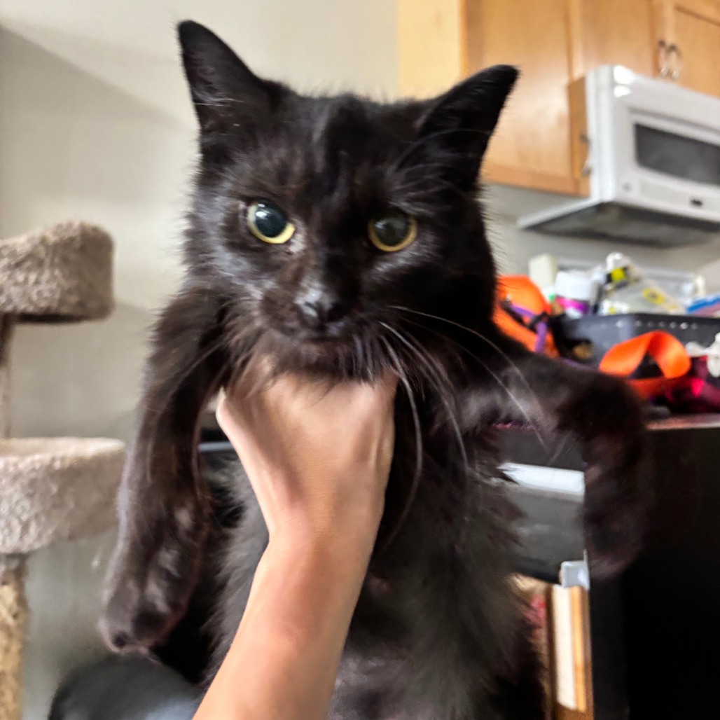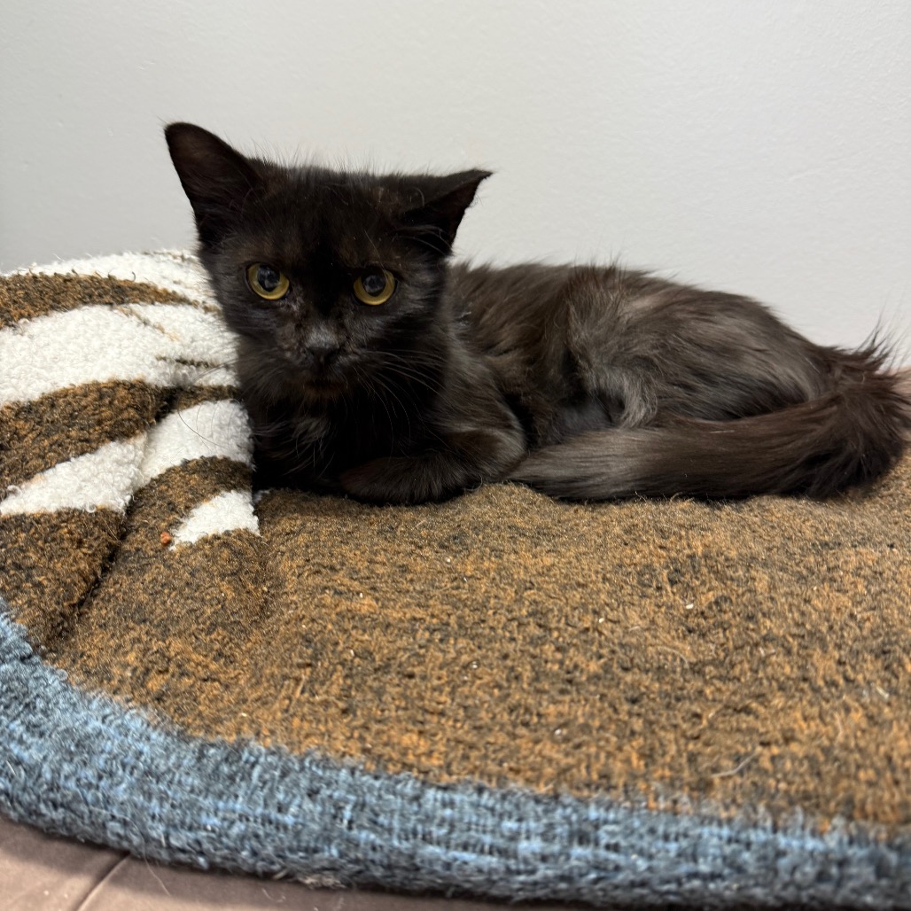 Pudding is a 7-month-old beauty with the softest black longhair coat and the sweetest personality to match. This gentle girl is friendly, affectionate, and always happy to soak up attention. She’s still young and playful, but also has a calm, cuddly side that makes her the perfect companion.