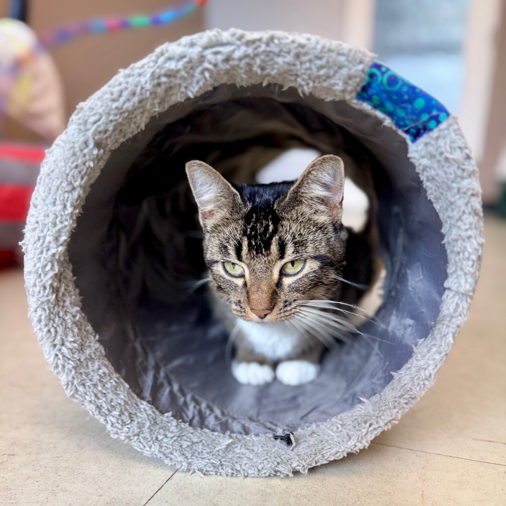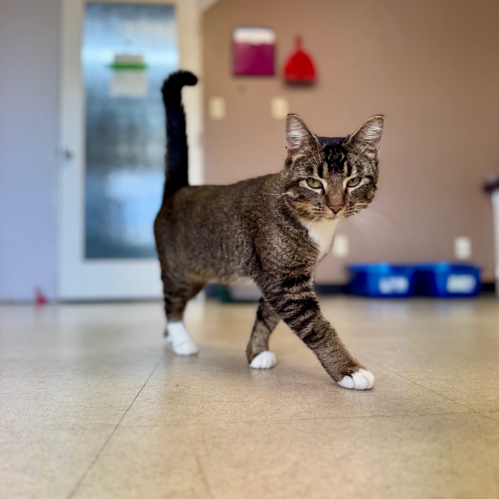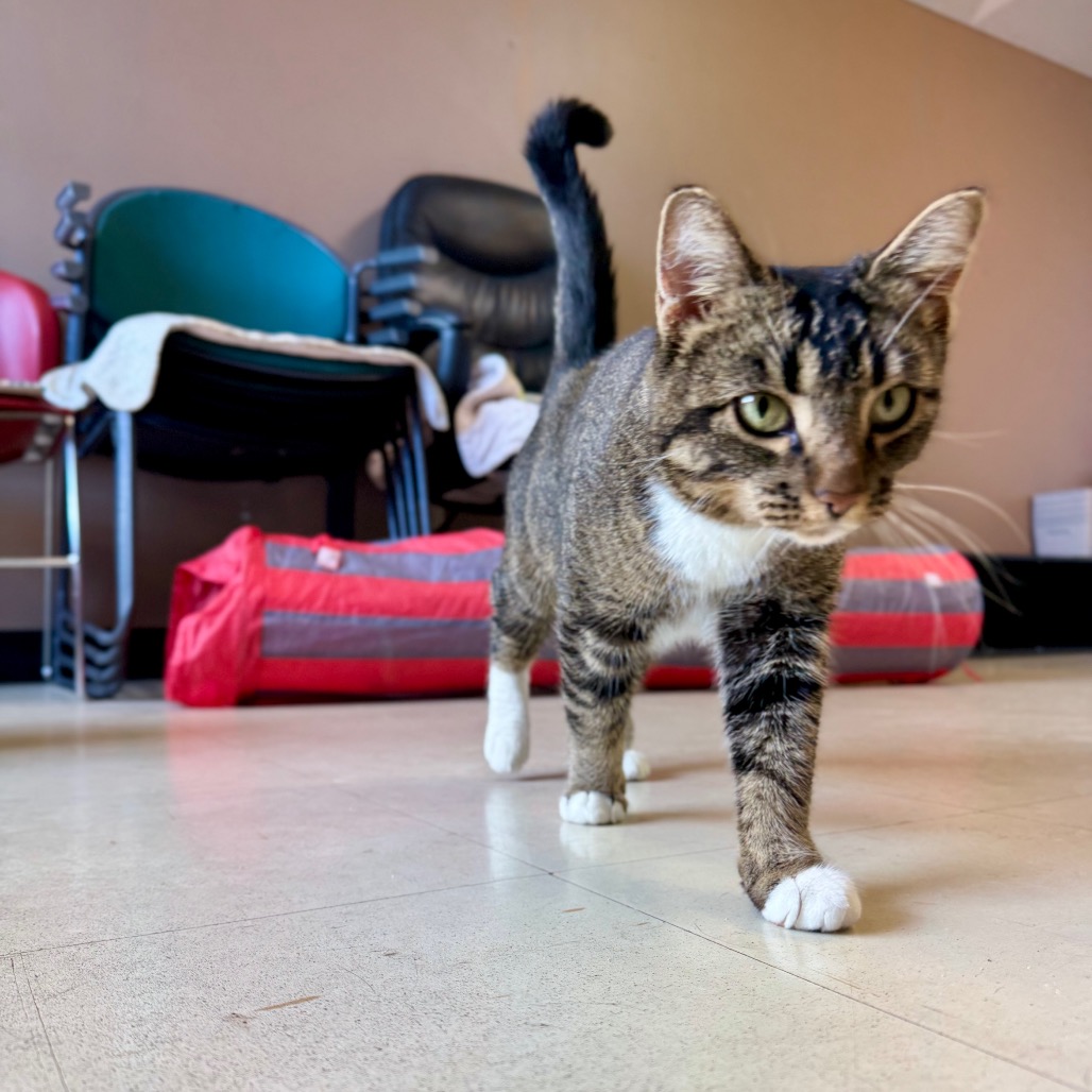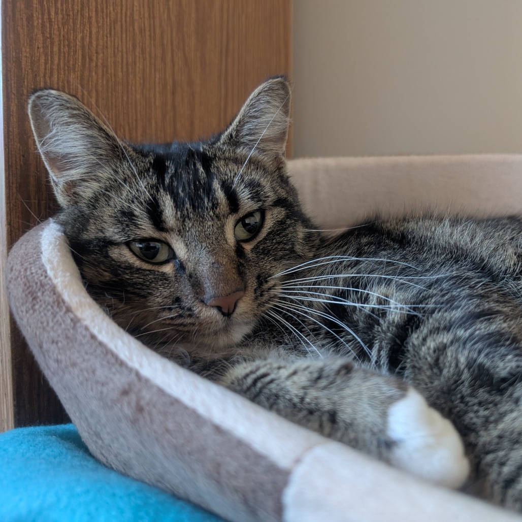 Hello everyone, Kitty here. I am a sweet Tabby girl who loves to be by her people. I am passed my kitten stages so no crazy shenanigans for me, just give me a comfy bed in a warm sun beam and I’ll be in heaven. I’m currently sharing a home with a dog but I prefer when she keeps her distance, so a home without a dog might be best. I am a very easy going girl otherwise and would love to meet you.
