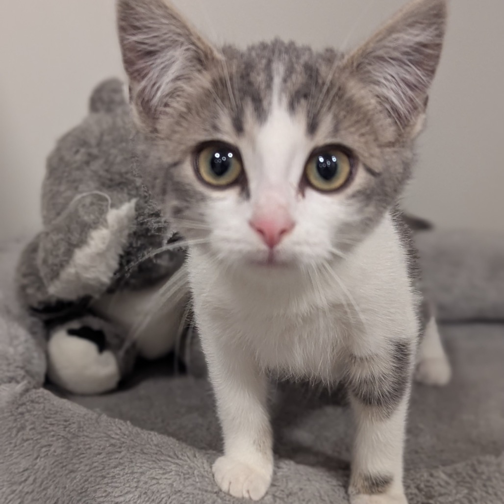 I’m a playful girl who loves chasing toys, wrestling with my kitten friends, and zooming around just for fun. When I’m all tuckered out, I’m a total cuddle bug — I love curling up for snuggles and purring the day away.