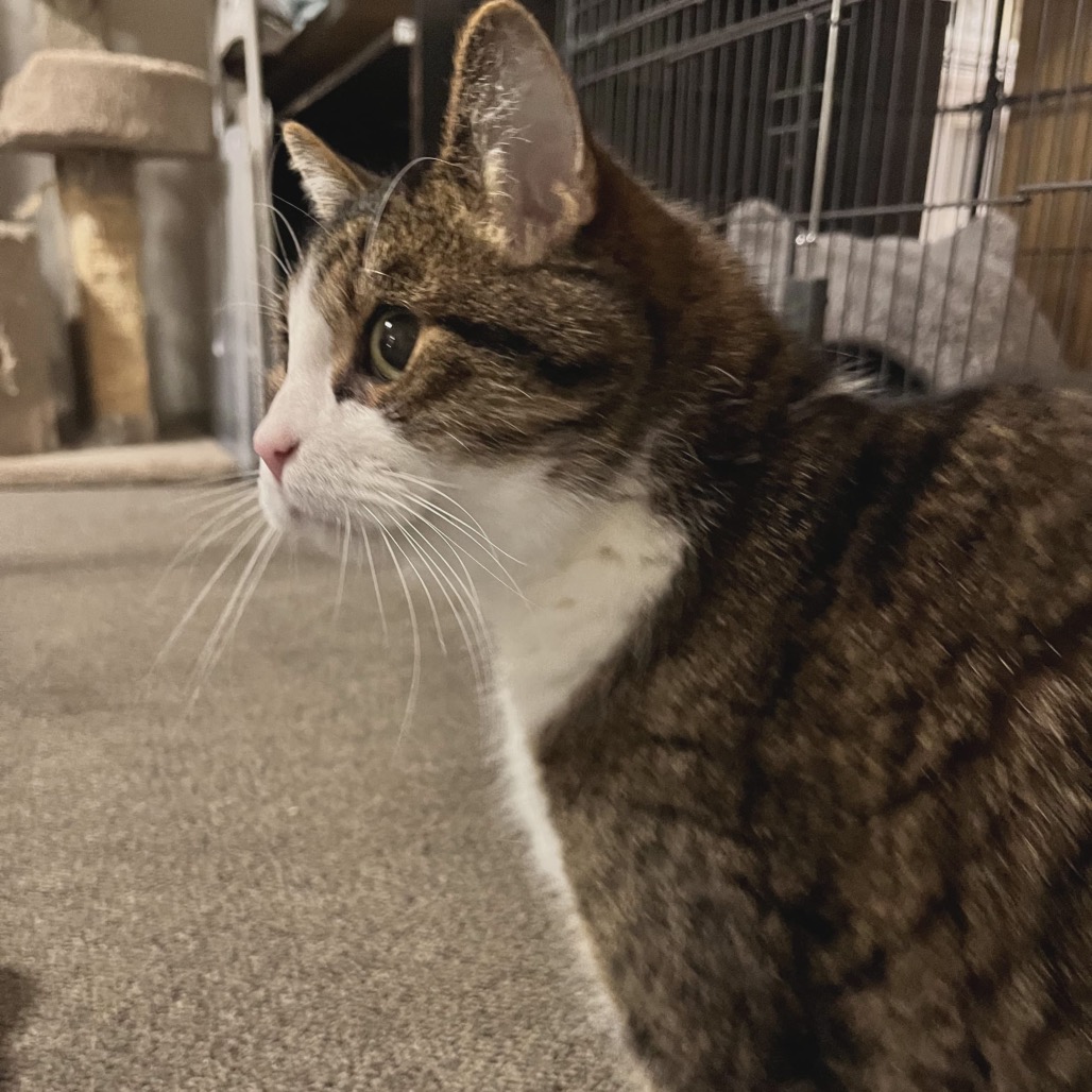 Hi, I'm Tex. Here in the shelter, I've perfected the art of relaxation. I enjoy lounging around, observing my surroundings with a calm demeanor. I'm not one for too much fuss; a quiet spot atop a cat tree suits me just fine. Though I value my independence, I do appreciate a gentle pat or a leisurely chat. My mellow nature makes me an ideal companion for someone who enjoys peaceful days. I am a tad overweight (okay.. more like a chunky monkey), so I'm on a diet to try to slim down. I may be big in size but it matches my heart and the desire to give and receive love. If you're looking for a serene buddy to share in the quiet moments, I'm your cat! Let's enjoy the simple joys together.