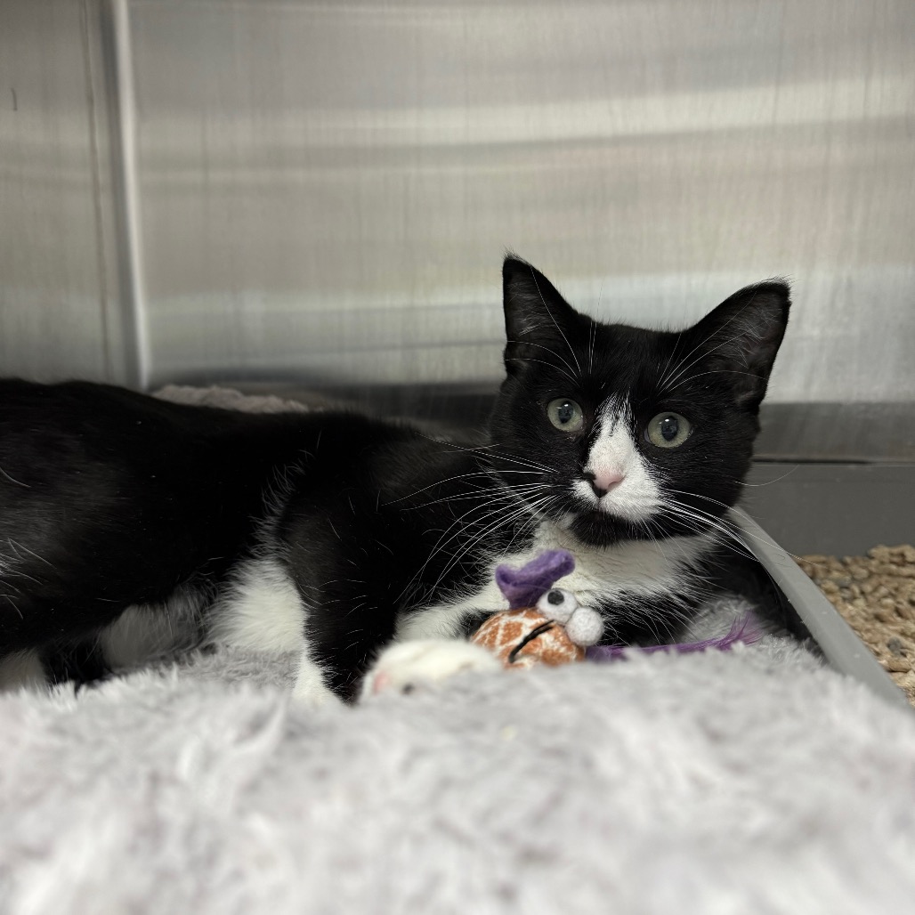 Hi I'm Shock. If you are looking for a kitty to give you unconditional love and companionship then I'm purrrfect for you! I am a friendly, gentle kitty with a sweet disposition and so much love to give any home. I can be shy but once you get to know me, I am a real snuggler and will purr when you give me lots of affection. I can keep myself busy playing with my toys or watching the birds out the window but sure love to run after a laser pointer or play with my fishing pole toy with you! I am a petite little girl with a unique tuxedo coat and beautiful eyes! I can't wait to go to my forever home - will you be mine?"