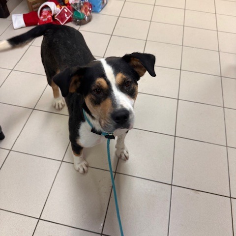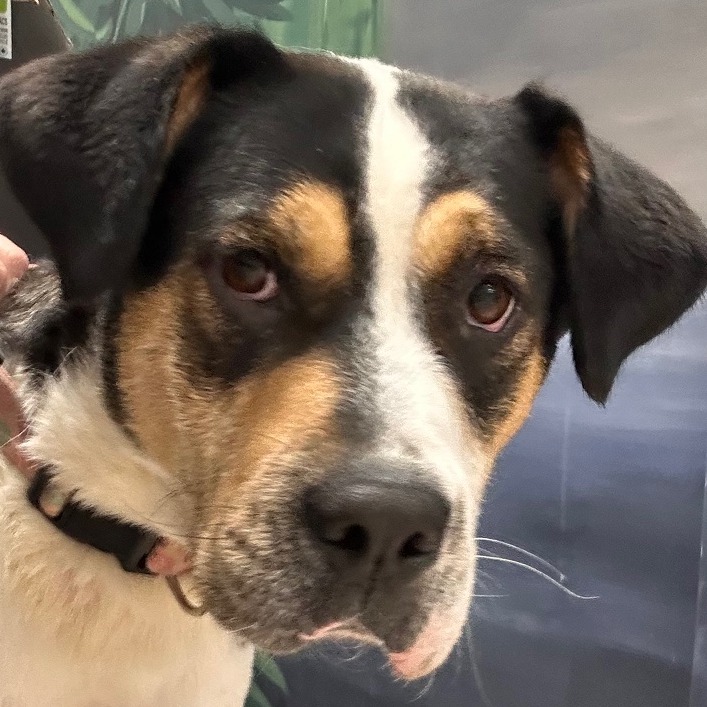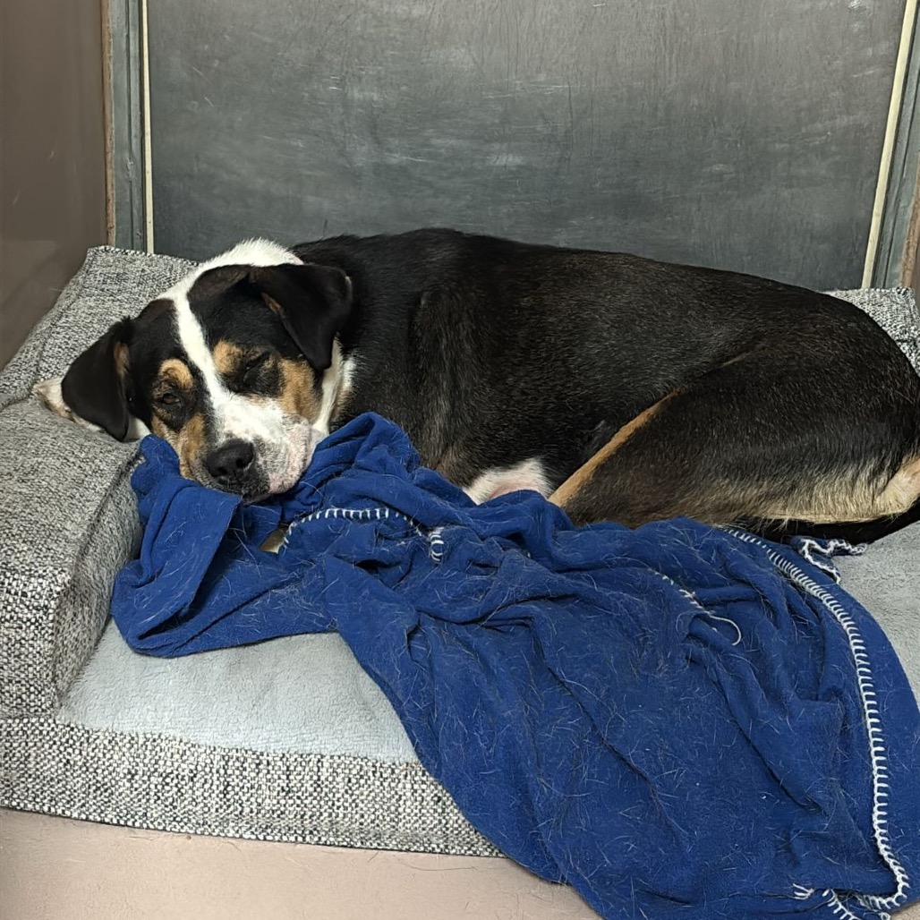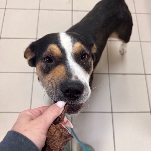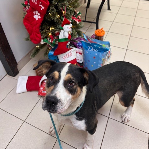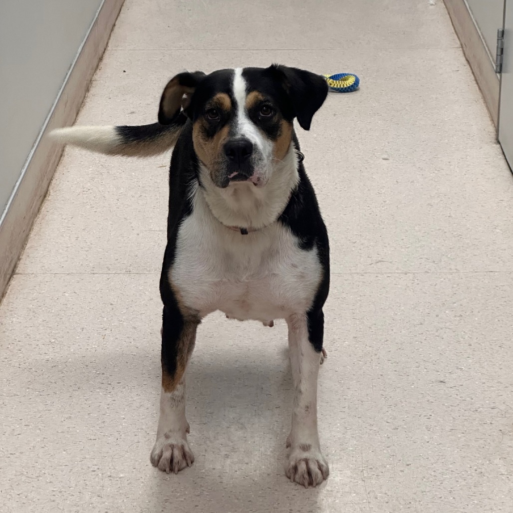This stunning 2-year-old Greater Swiss Mountain Dog is as sweet as they come. Evangeline—known around here as Evie—is a gentle, affectionate girl who wins hearts instantly. Highly food-motivated and eager to please, she’s taken to training beautifully and picked up the shelter routine in no time. She aced her leash skills right away and continues to make steady progress every day.