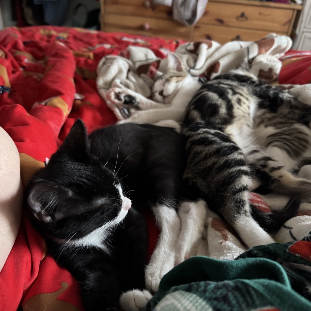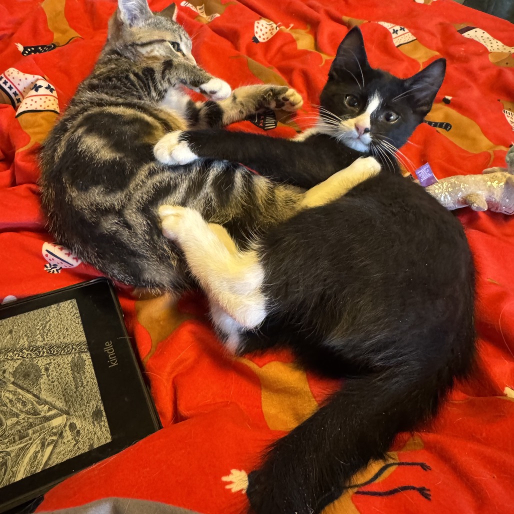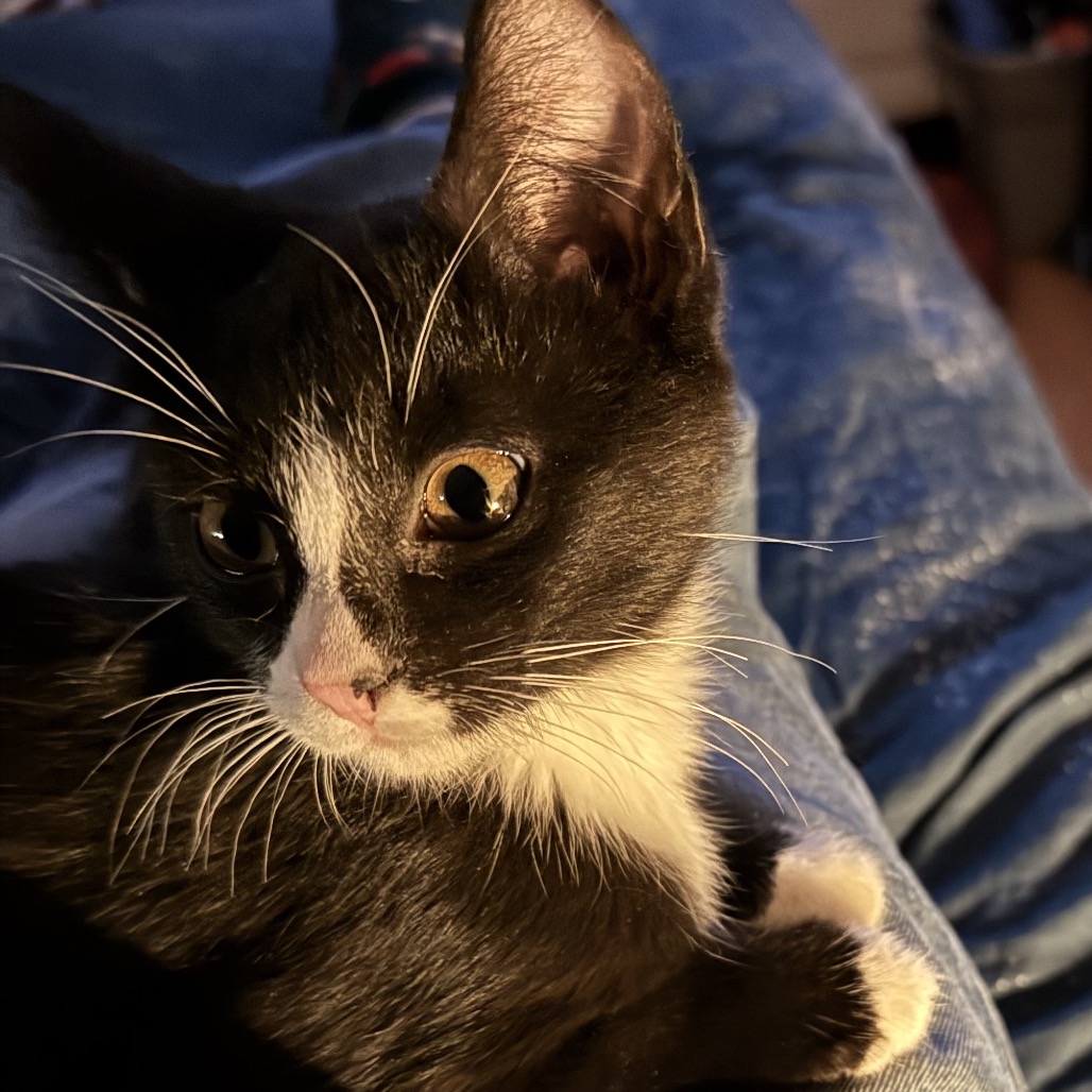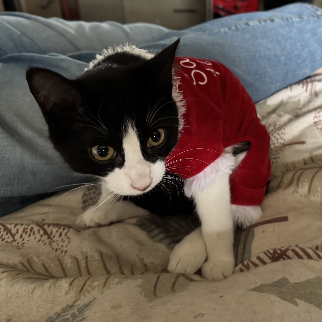 Faelar is the most handsome boy. His tuxedo is ready for any elfish trouble he can get into(I looked up his elfish name🤣). He is a very outgoing, explorative boy who also loves to purr and snuggle. Like his brother and sisters, he loves his people, is okay with the dogs, and plays well with his siblings. 3.5 months and ready for forever!