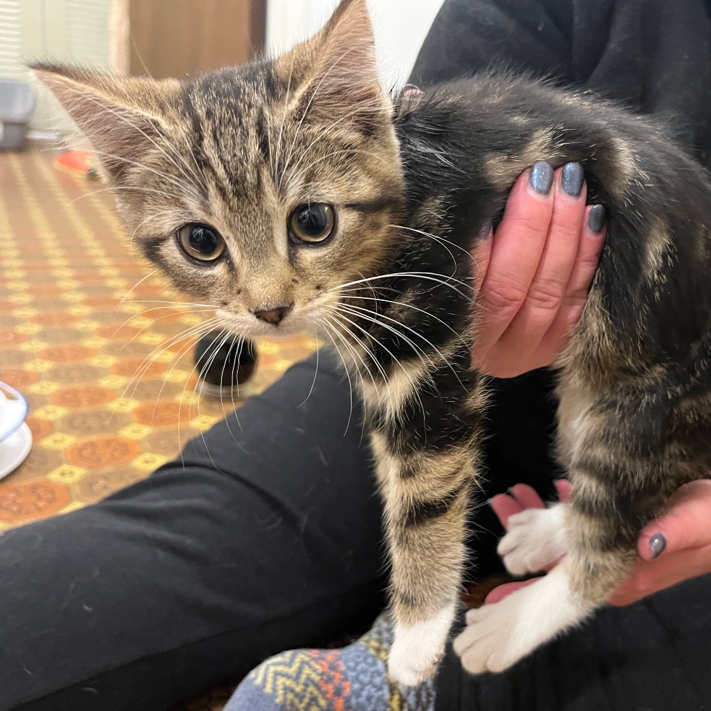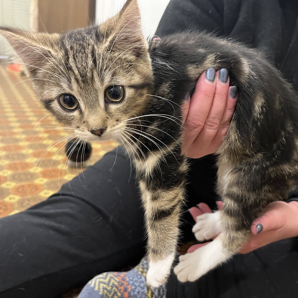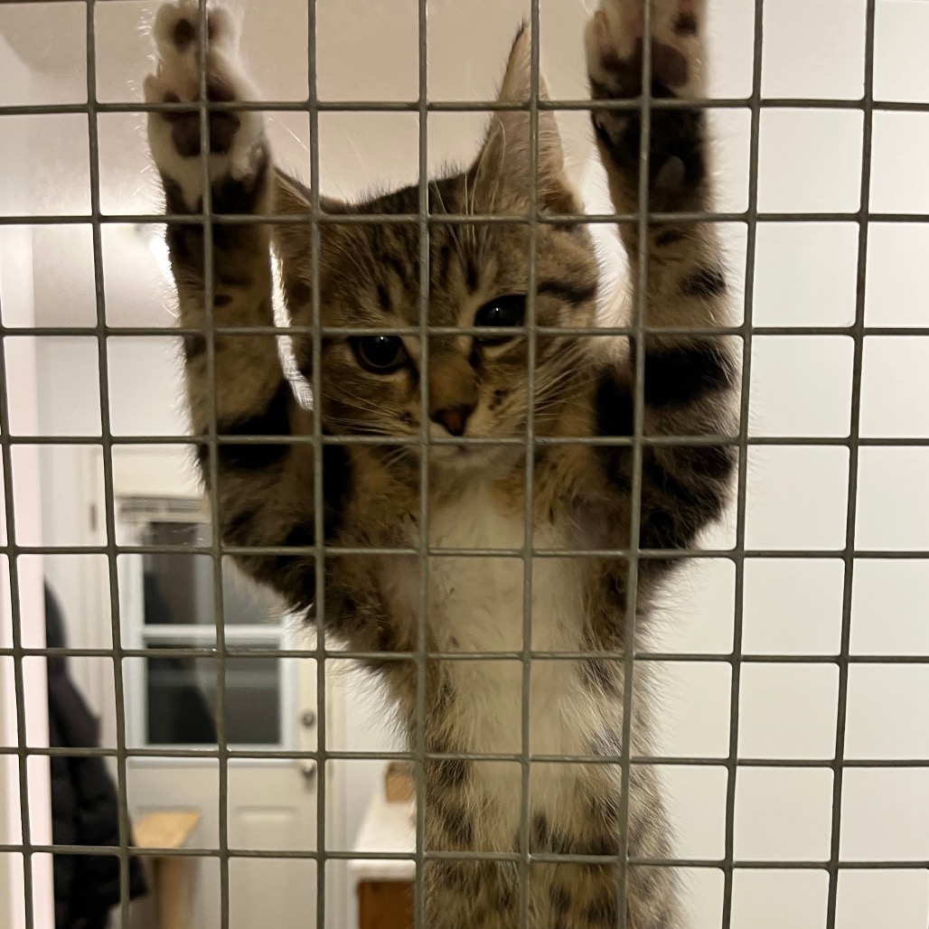 Hi, I'm Silk! You can tell me apart from my sisters by classic, blotched tabby pattern. I'm a little acrobat who loves to leap after springy toys and chase my favourite sister Wool. Once we wear ourselves out, you'll often find the two of us curled up together. One of my favourite activities is to play with my foster family's cats through the mesh door, they're endlessly facinating. The best home for me would be one where my people can give me lots of attention to keep me busy. I've never met a dog before, but since I got used to my foster family's cats I've been wishing to play with them in person instead of just through a gate.