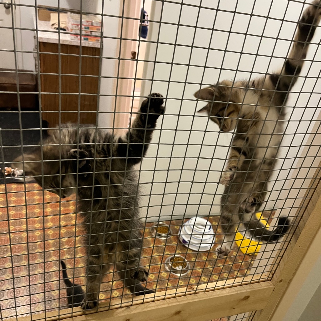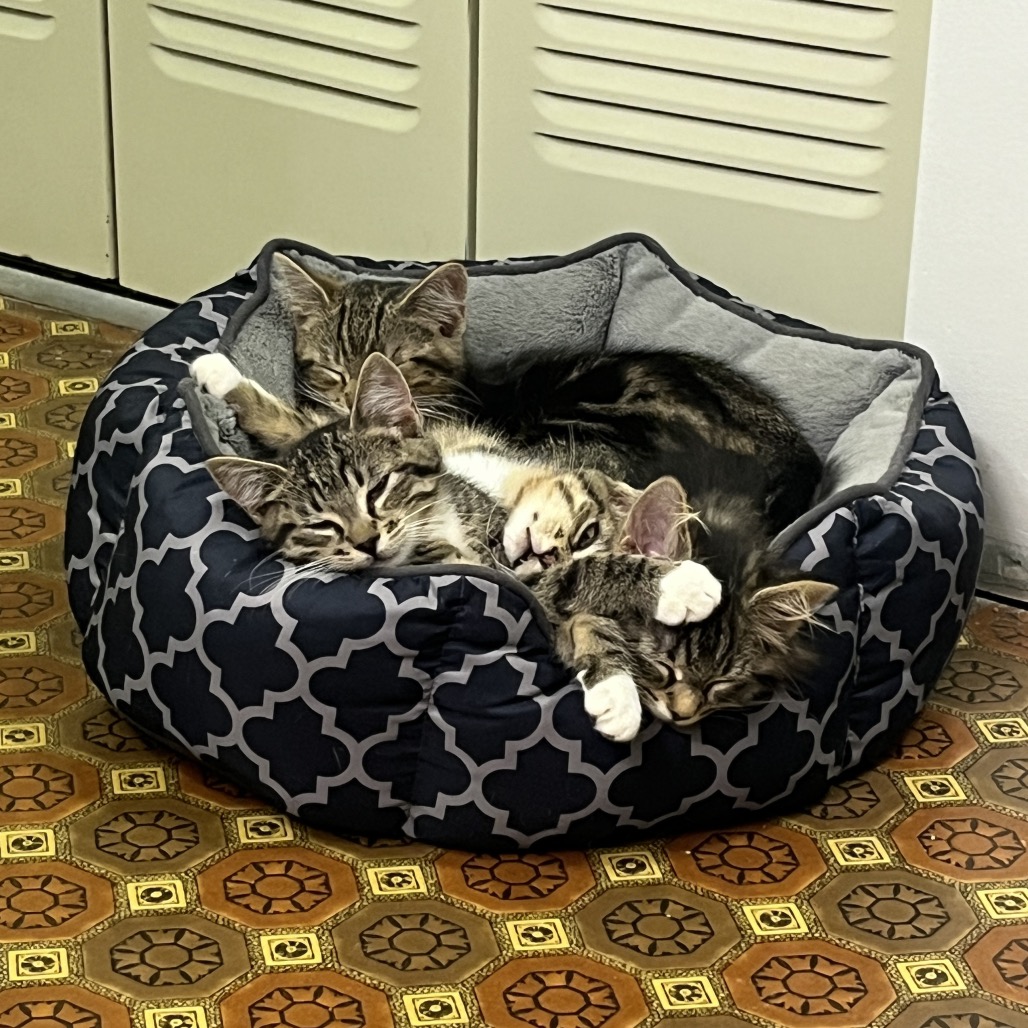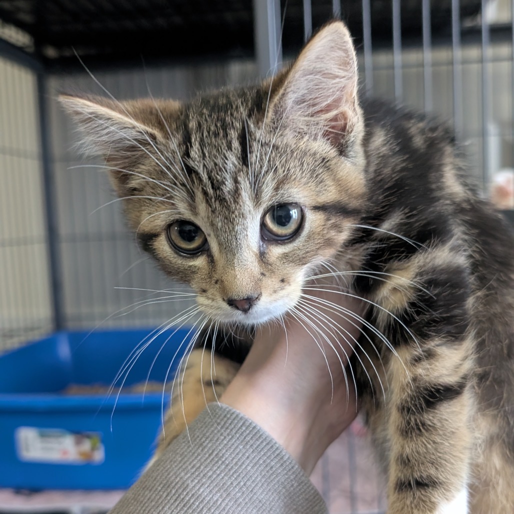 Hi, I'm Silk! You can tell me apart from my sisters by classic, blotched tabby pattern. I'm a little acrobat who loves to leap after springy toys and chase my favourite sister Wool. Once we wear ourselves out, you'll often find the two of us curled up together. One of my favourite activities is to play with my foster family's cats through the mesh door, they're endlessly facinating. The best home for me would be one where my people can give me lots of attention to keep me busy. I've never met a dog before, but since I got used to my foster family's cats I've been wishing to play with them in person instead of just through a gate.