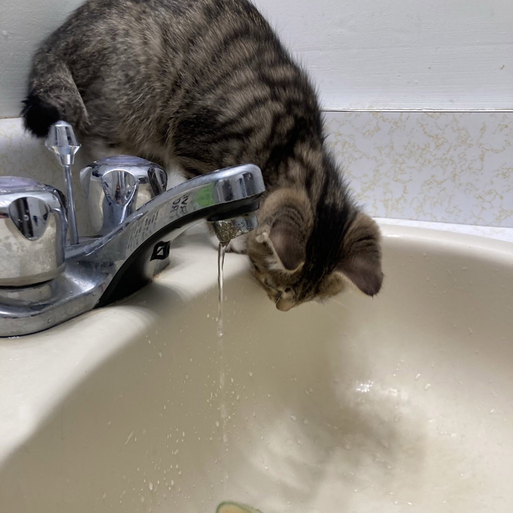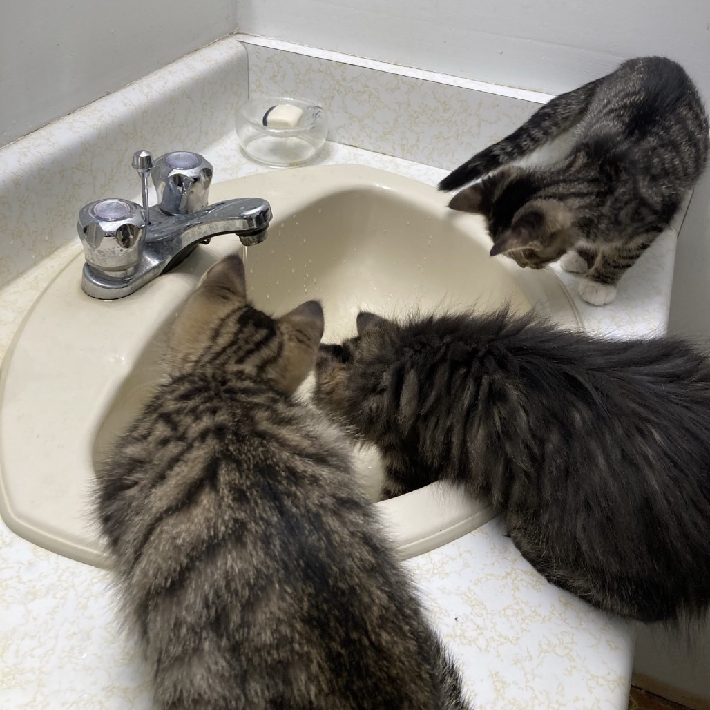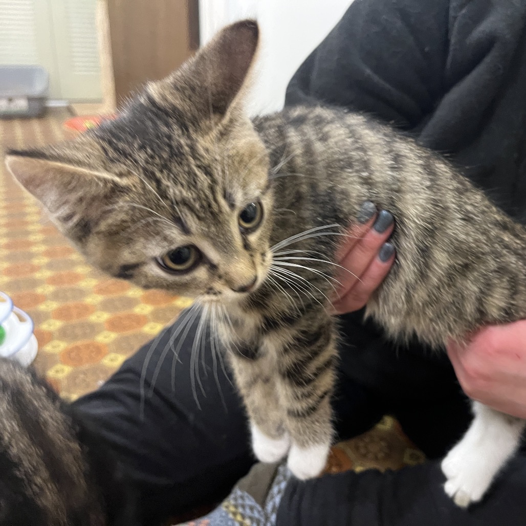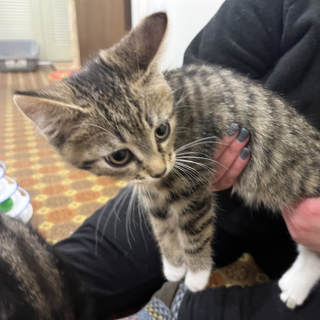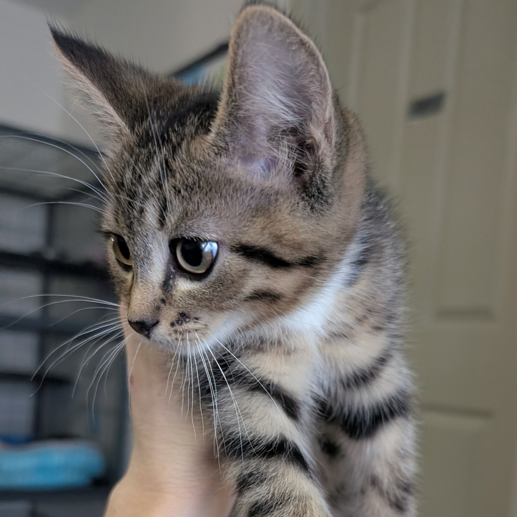 Hi, I'm Velvet! I'm the lighter of the two Mackerel (striped) tabbies. You can tell me apart from my sister Nylon by my light whisker spots and the lighter streak down my back. If not for that, you'd have a hard time telling us apart! Speaking of Nylon, although I love all my sisters and get along with them great, she's my best friend and we spend most of our time playing or snuggling together. Of all my sisters, I'm the friendliest with humans, and that's saying something! The best home for me would be one where my people can give me lots of attention and have time to play with me, and snuggle when I get tired. I'd be especially happy if one of my sisters can come too so I can have a partner in crime. I've never met a dog before, but since I got used to my foster family's cats I've been hoping to play with them in person instead of just through a gate.