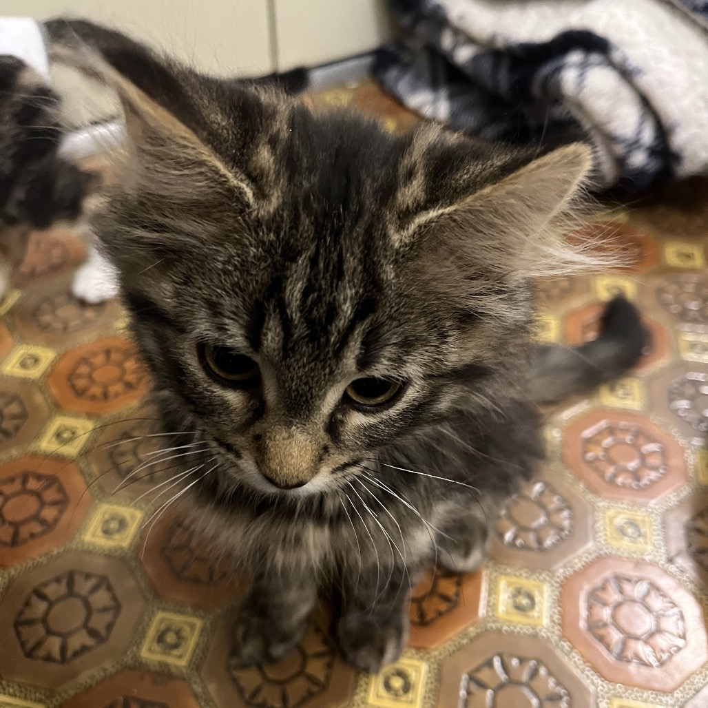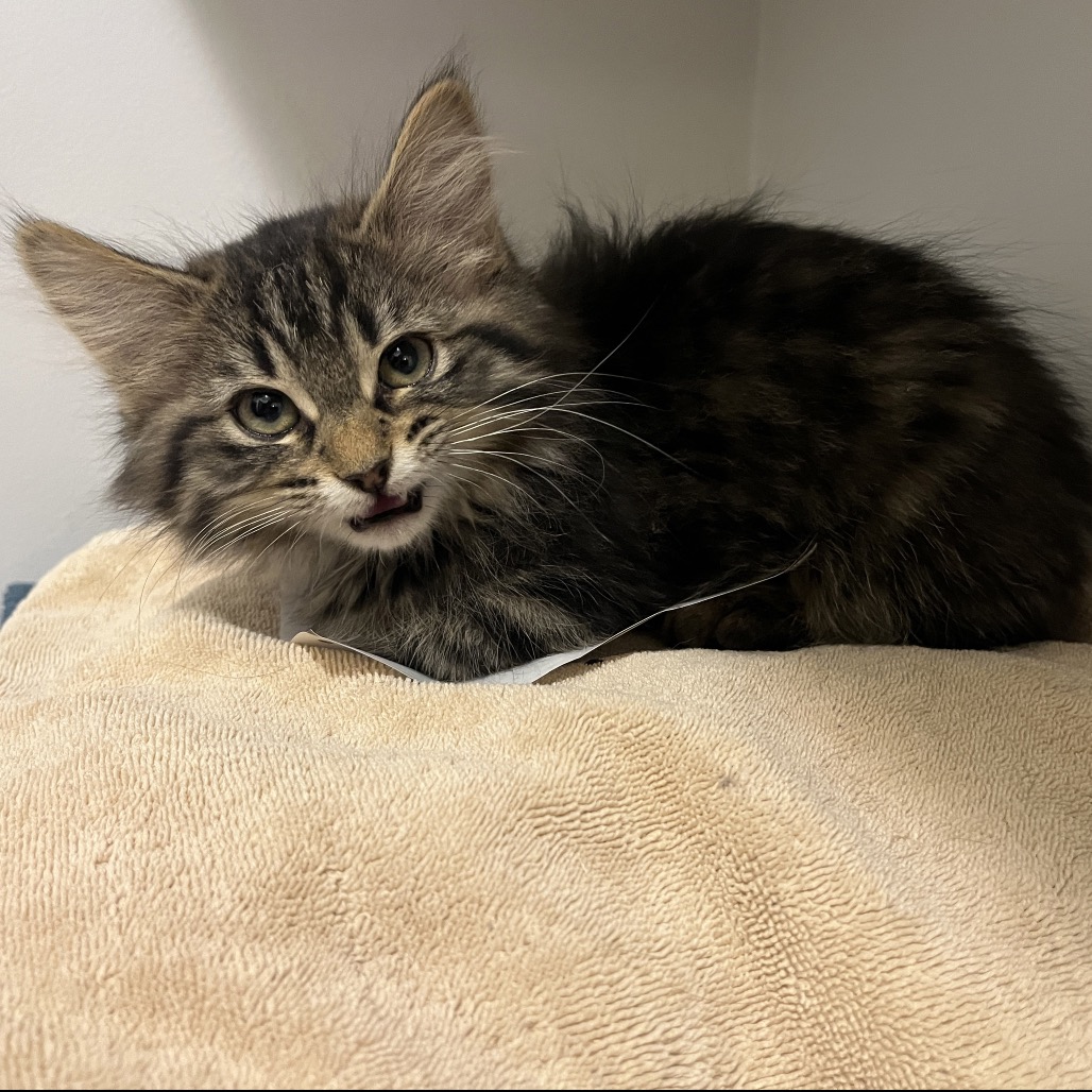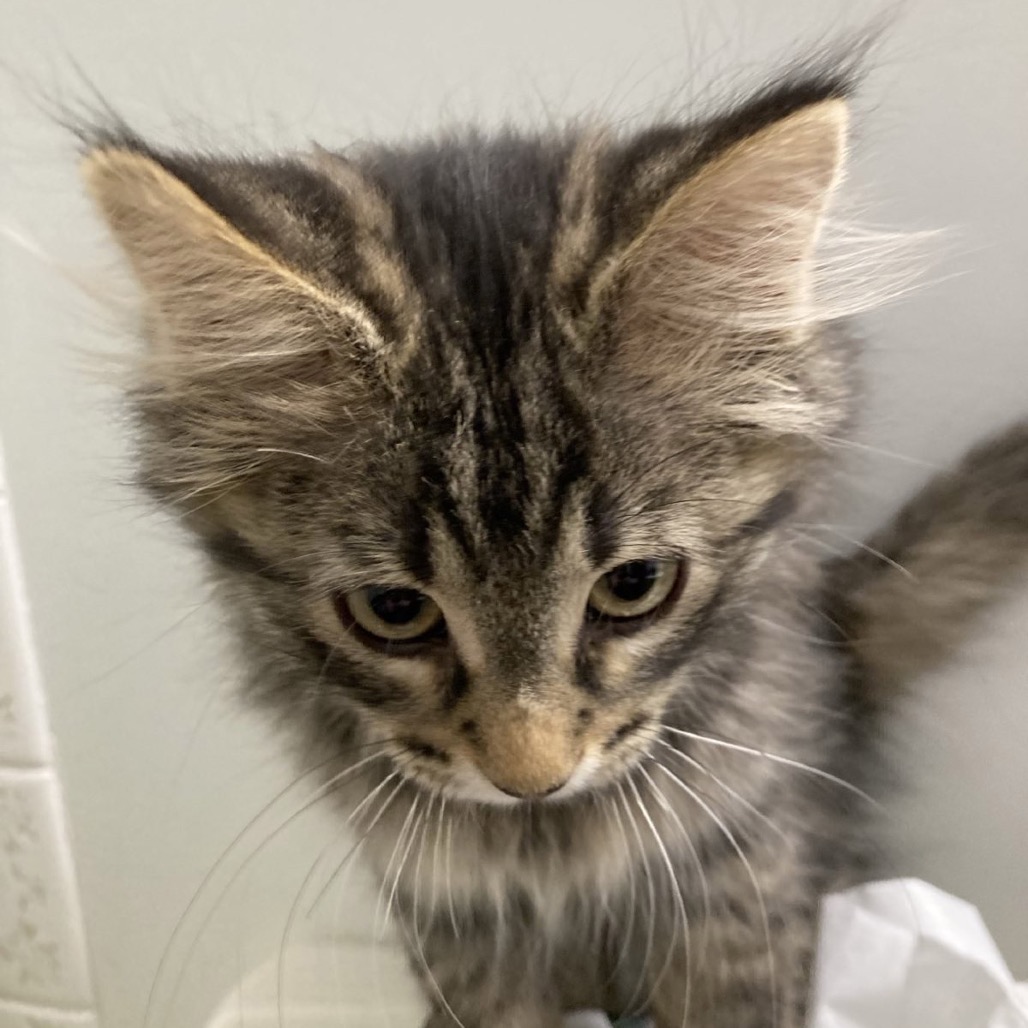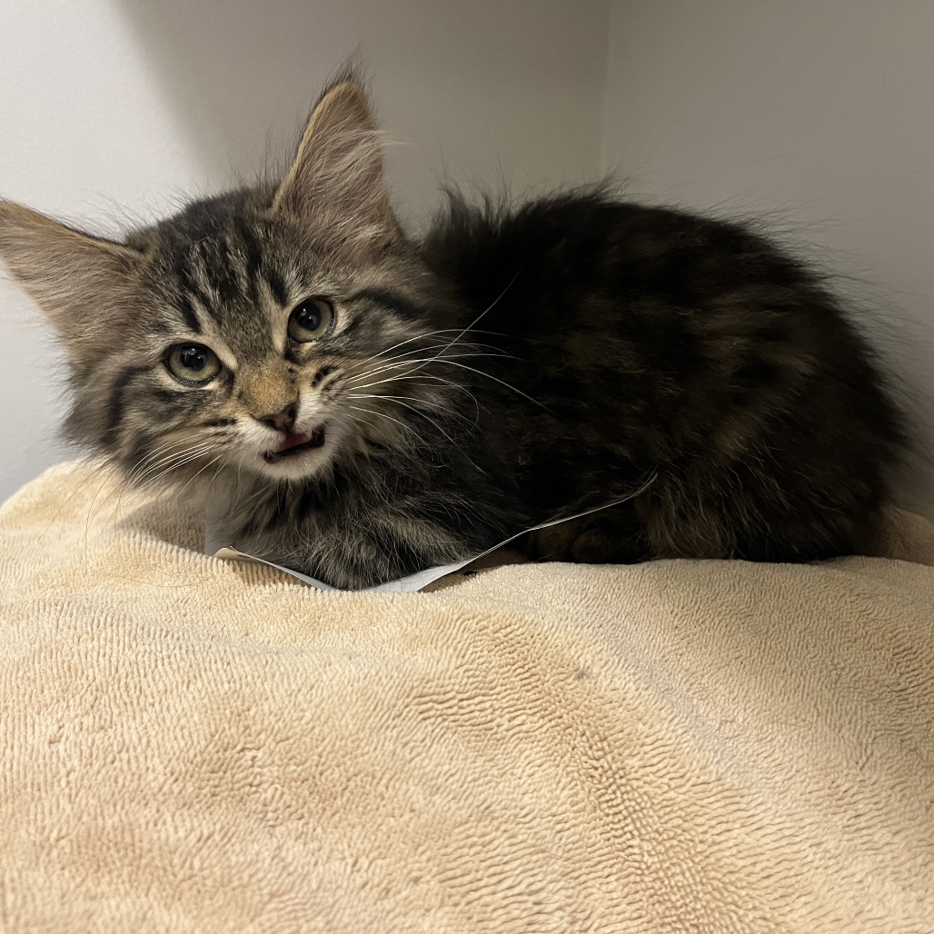 Hi, I'm Wool! You can tell me apart from my sisters by my beautiful, long hair. When I'm not asleep in the kitten pile I'm an independant explorer who likes to keep watch over my territory from a high vantage point. When I'm feeling playful, I like to chase my sister Silk around and once we wear ourselves out, you'll often find us snoozing together. The best home for me would be one where my people can give me lots of attention and brush me from time to time to keep me looking my fluffy best. I've never met a dog before, but since I got used to my foster family's cats I've been hoping to play with them in person instead of just through a gate.