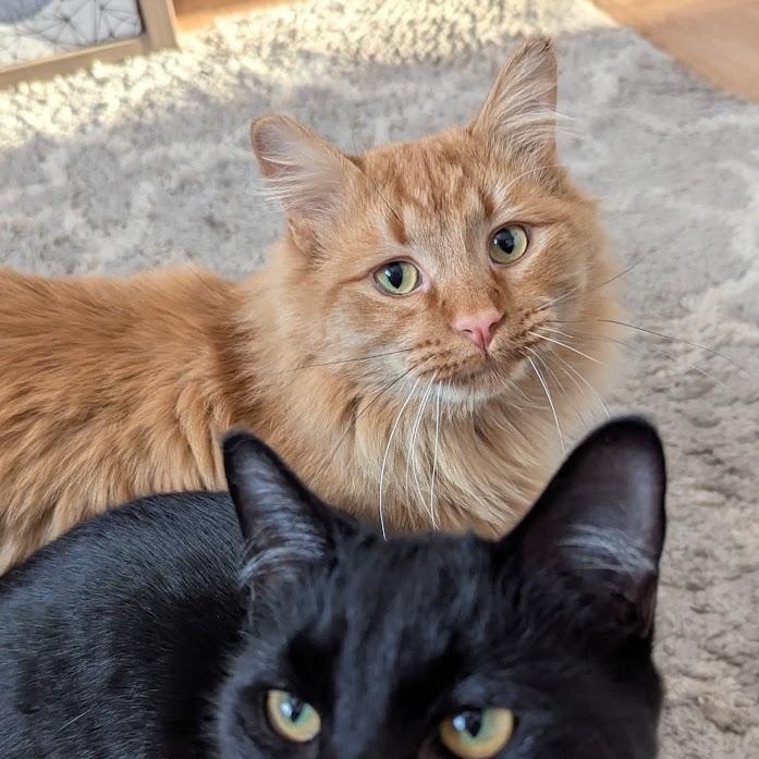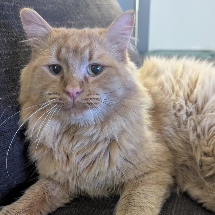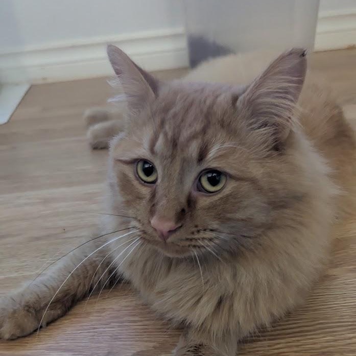 Hi there, I'm Korvan! I'm a big fluffy boy with a big heart. I'm much quieter than my brother Frodo, and a bit less needy. I do still love my pets and snuggles though! I may be a big boy, but I'm still pretty young and like to play sometimes. I'm pretty chonky, so I'd like for my future family to help me get to a healthy weight. My fur is super soft and will also need to be brushed often to make sure it doesn't get matted. I can be a bit timid in new environments but after a few days I'll make myself at home. I'd love to be adopted with my brother Frodo, but I'd be just fine as an only cat as well. I have no issues with the resident cat or dog, so if you have either that's okay! Do I sound like the perfect kitty for you? Then click the Adopt Me button!