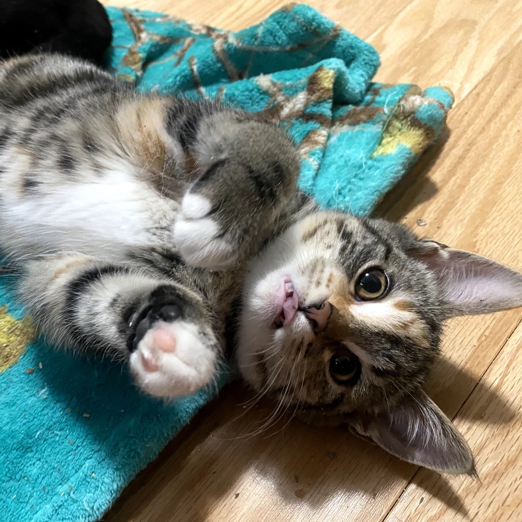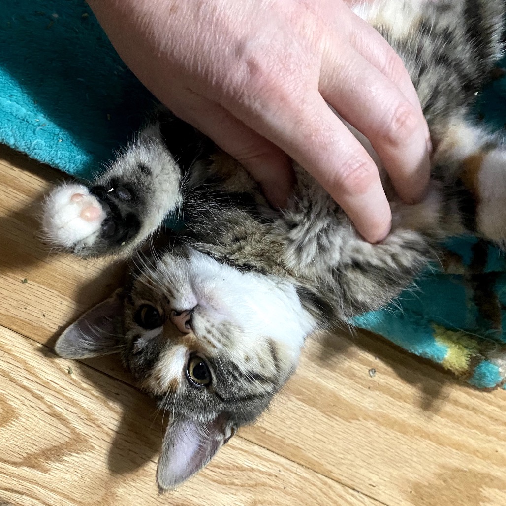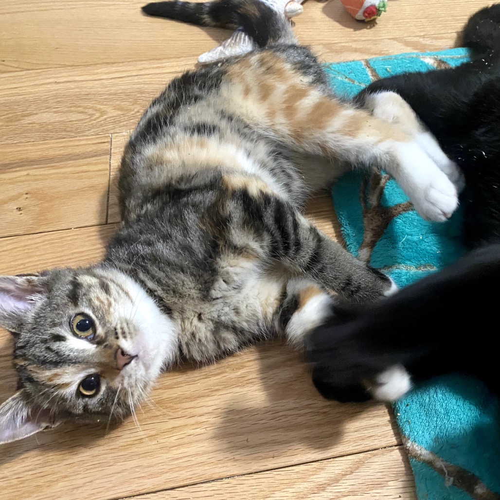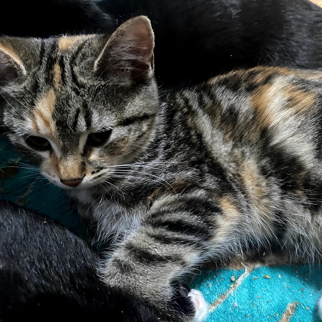 Hello, my name is Metallica! I’m a sweet girl who loves to cuddle, give kisses, and play with toys. I’m pretty laid back for my age and am really good about not treating hands as toys. I’m the only girl in my litter and it shows – I wrestle just as much as my brothers and put them in their place every time, even though I’m much smaller than them. I have a really gorgeous coat with lots of colours and patterns, certainly one of a kind. My favorite thing is my brother Pantera. He’s the biggest boy in our litter and I’m glued to him. He’s my favorite sibling to play with and is the only one I cuddle with regularly. I would love to go to my forever home with him so we can grow up together, but I can also be adopted solo. My ideal home would be full of snuggles, attention, good food, and lots of playtime.