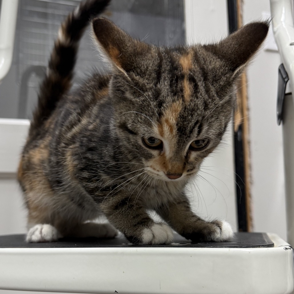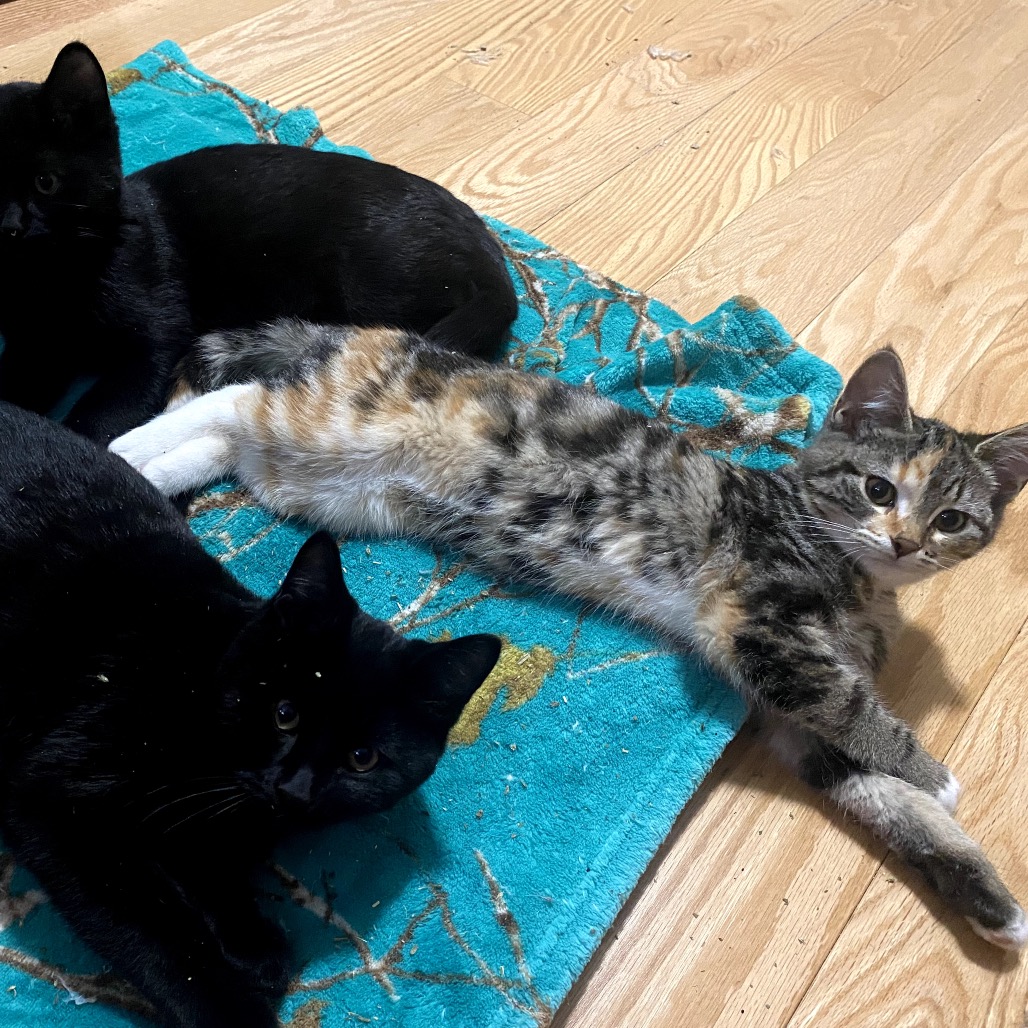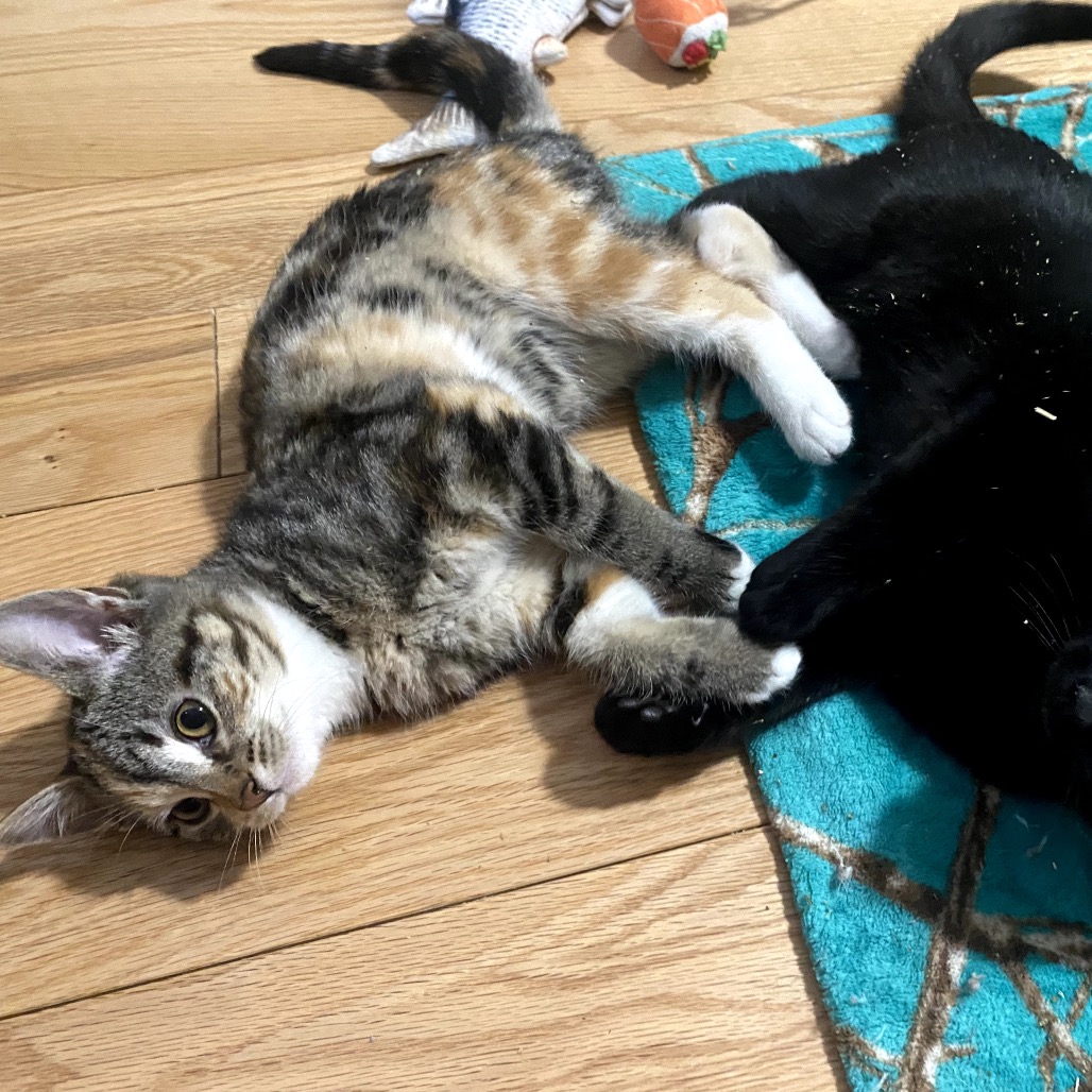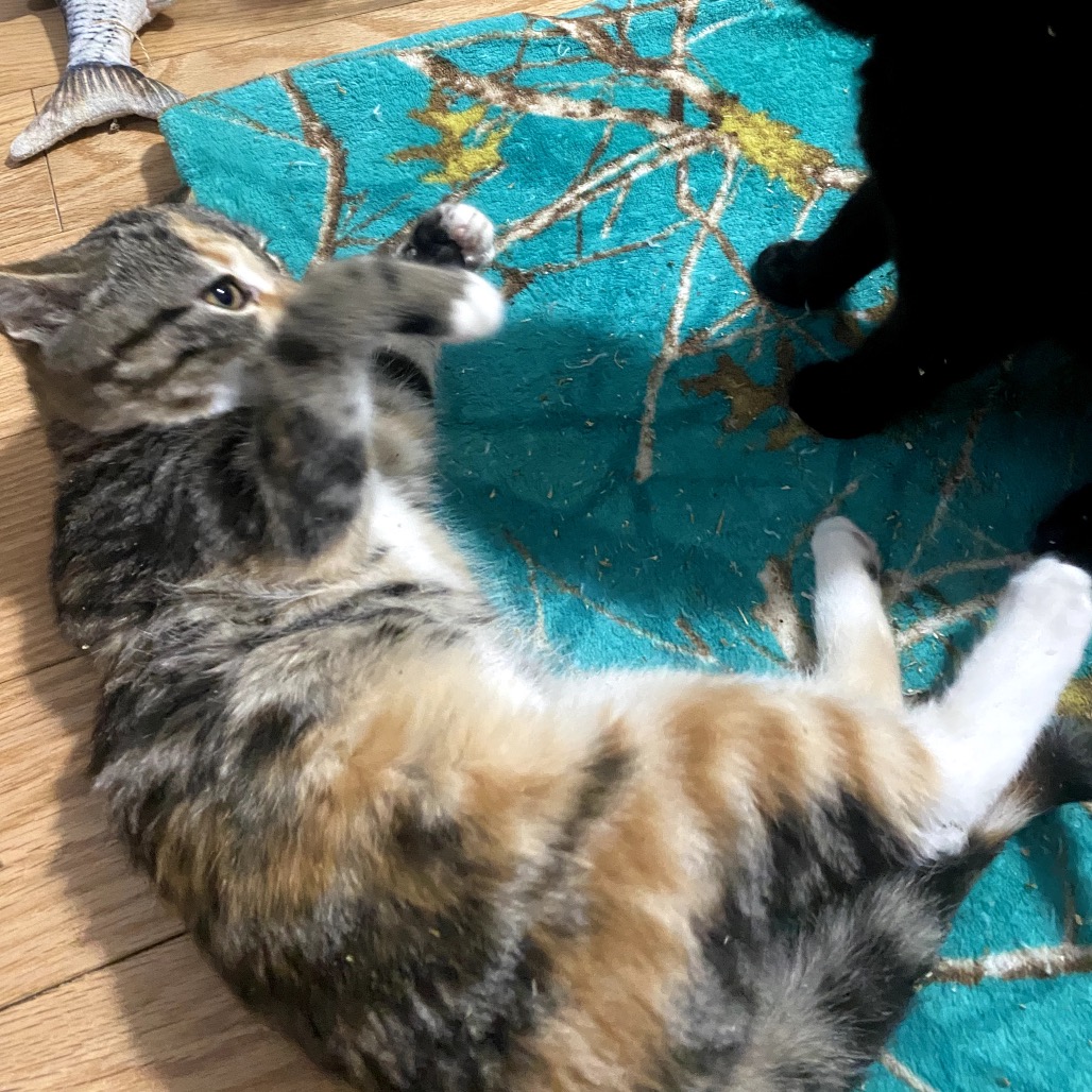 Hello, my name is Metallica! I’m a sweet girl who loves to cuddle, give kisses, and play with toys. I’m pretty laid back for my age and am really good about not treating hands as toys. I’m the only girl in my litter and it shows – I wrestle just as much as my brothers and put them in their place every time, even though I’m much smaller than them. I have a really gorgeous coat with lots of colours and patterns, certainly one of a kind. My favorite thing is my brother Pantera. He’s the biggest boy in our litter and I’m glued to him. He’s my favorite sibling to play with and is the only one I cuddle with regularly. I would love to go to my forever home with him so we can grow up together, but I can also be adopted solo. My ideal home would be full of snuggles, attention, good food, and lots of playtime.