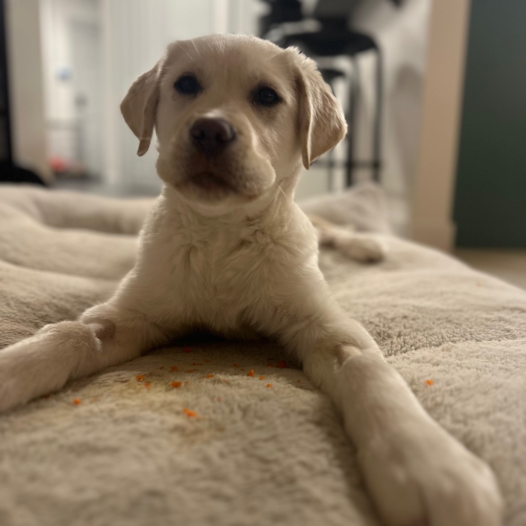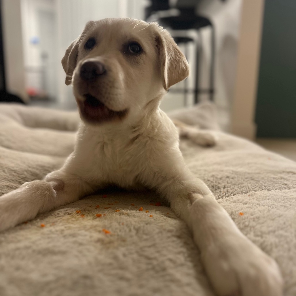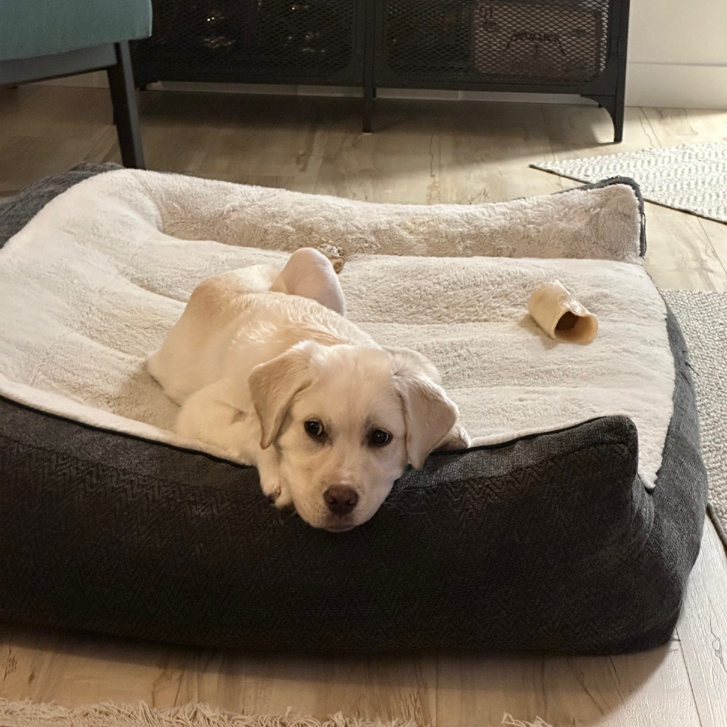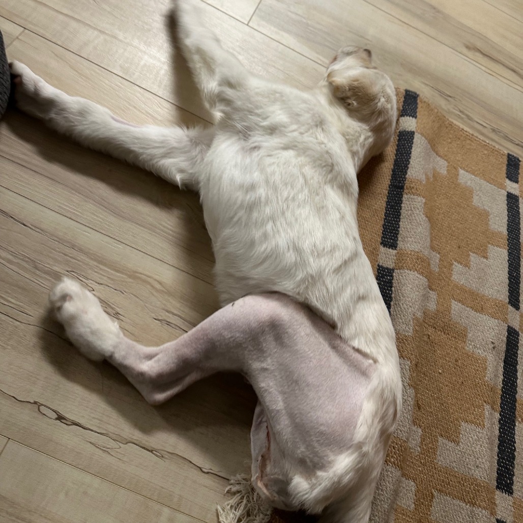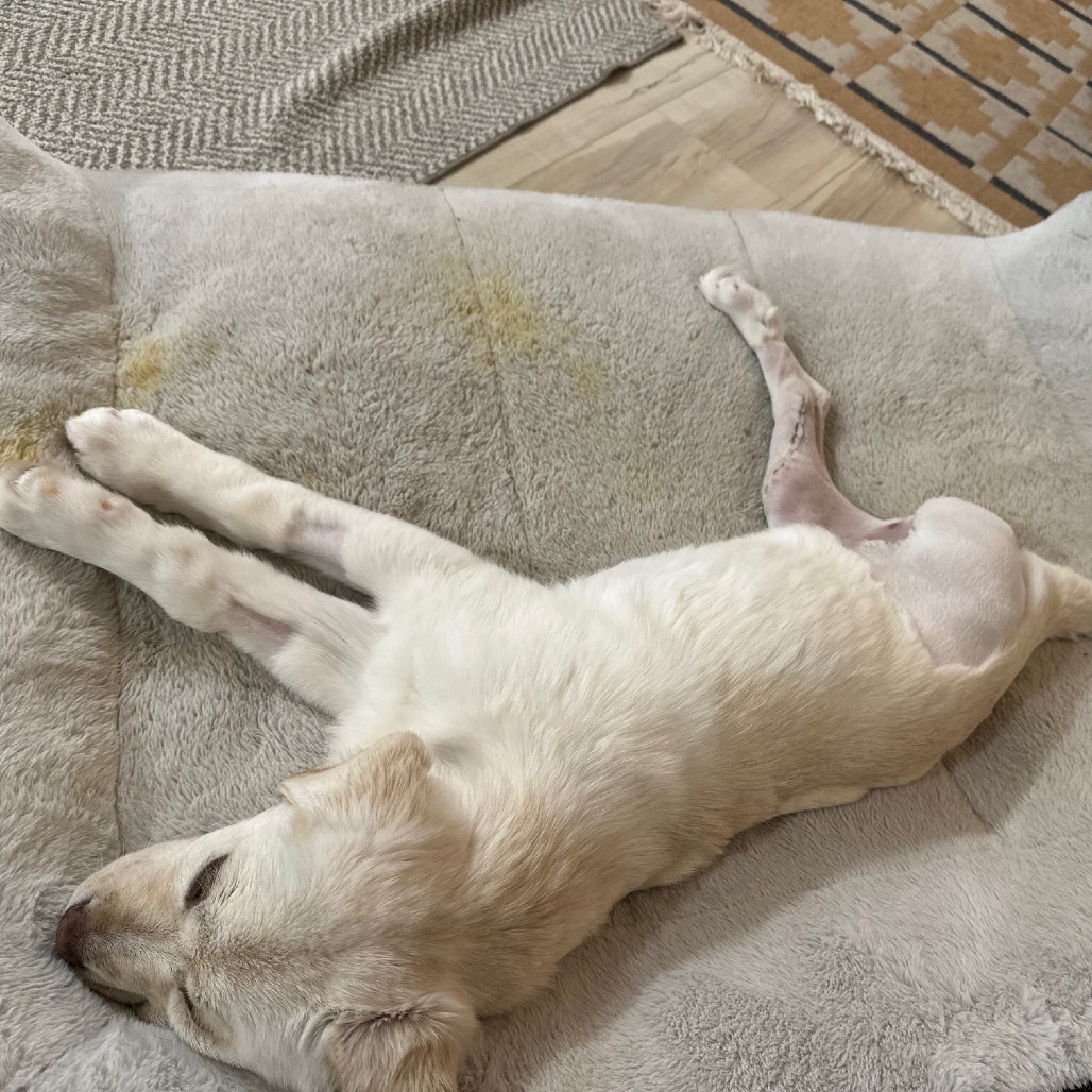 I’ve also discovered something amazing: carrots! They are my new favorite treat. I get a yummy stuffed Kong every day, too. I’m doing pretty well in my crate when everyone is home, though sometimes I get a bit whiny when the family is up and about and I have to keep resting. At night, though? I sleep like a total champion.