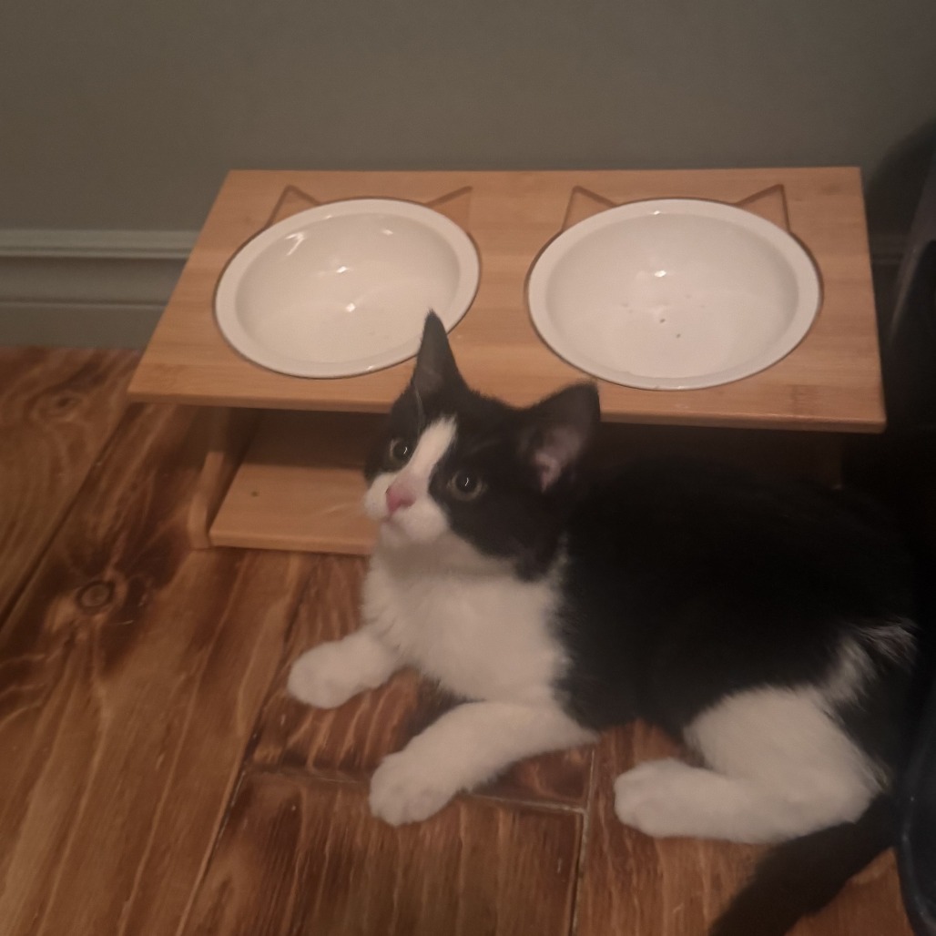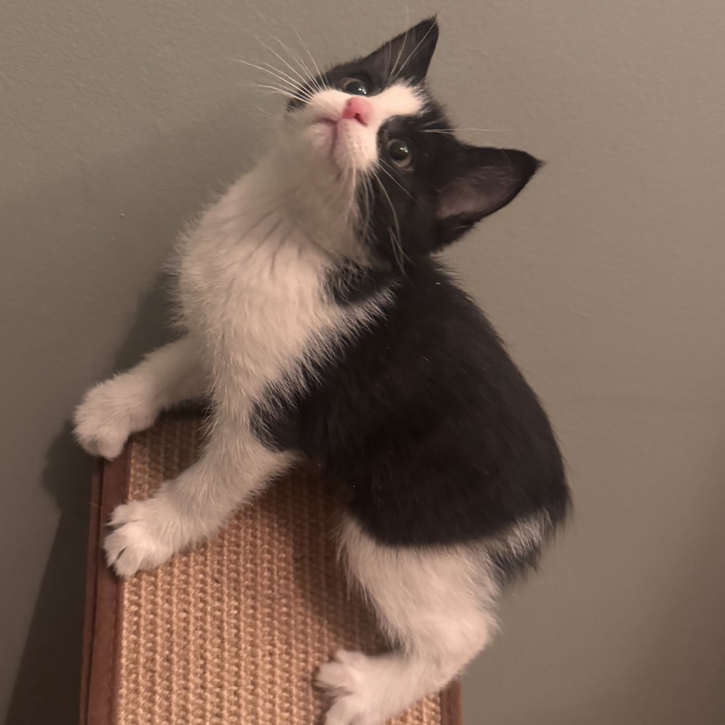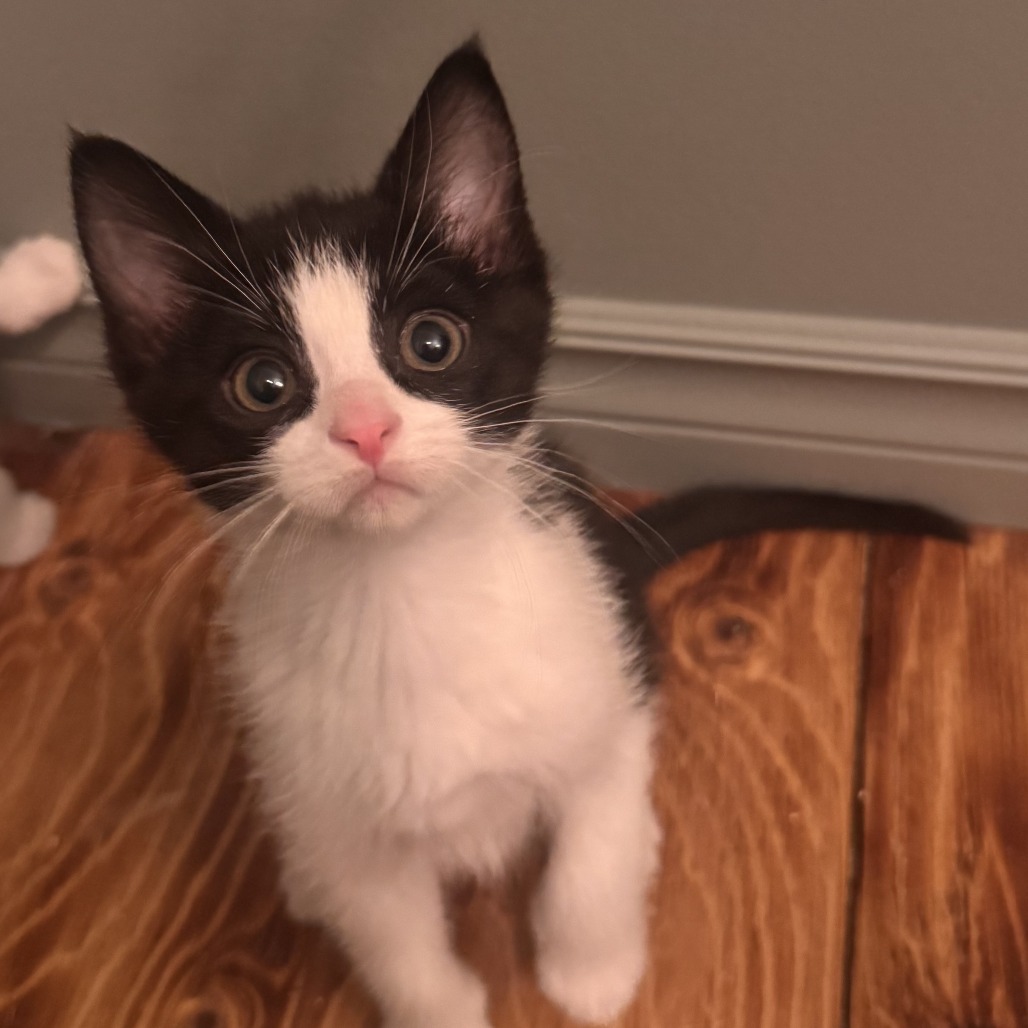 Sheldon is a perfectly dressed tuxedo kitten with a cute little pink nose and a whole lot of personality. While he may look sweet and innocent (and he absolutely is!), Sheldon is also a confident little explorer who loves leading his siblings into fun games and playful adventures. He’s curious, smart, and full of kitten joy. When playtime winds down, Sheldon happily settles into your lap, purring like a tiny motor and soaking up all the cuddles. He’s the kind of kitten who will bring laughter, love, and charm to any home.