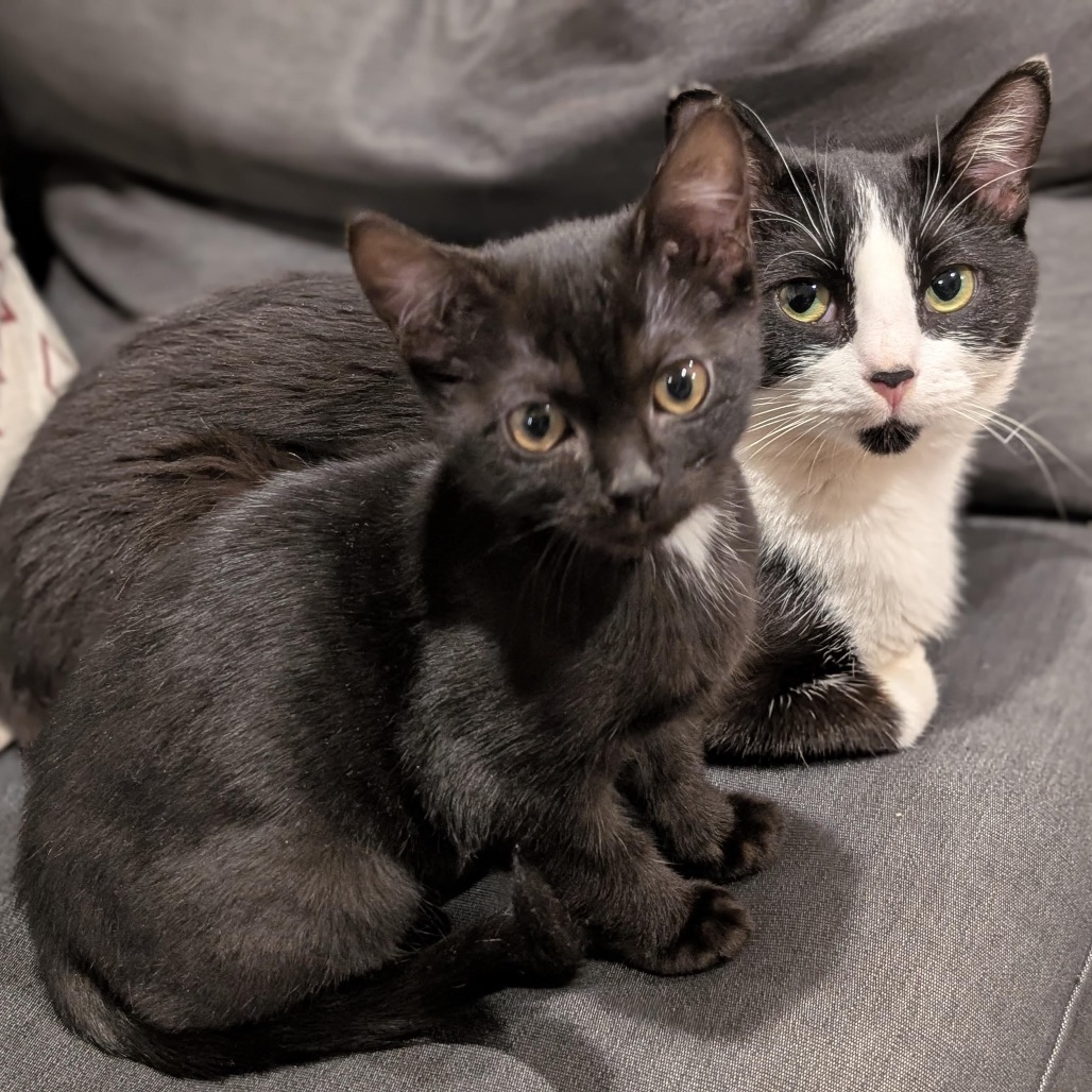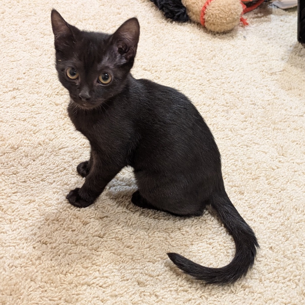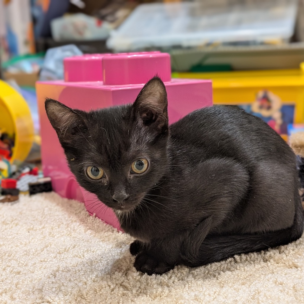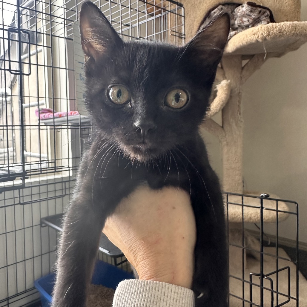 Hi I am Buddy the Elf. Don’t let the name confuse you, I am a lovely little girl cat and not an elf at all. I think they named me that because I just want to be your friend and I am very petite! Yes, I want to cuddle with you and be your friend but don’t worry I have been eating a lot and won’t be petite forever! Like my mom Jovie, I am very human-focused. When I am not wrestling with mom or chasing toys around I am the first to investigate what the humans and the other animals in this foster house are up to. I am mostly black with the tiniest puff of white on my chest.