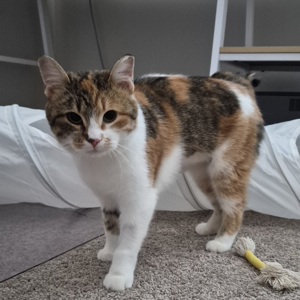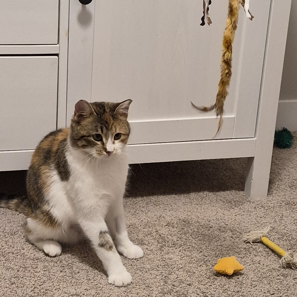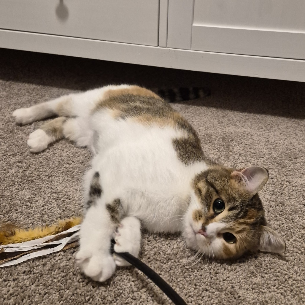 My name is Papaya. I am a striking little girl. I take some time to warm up and get used to new people but once I am more comfortable I can purr up a storm and enjoy some pets. I have realized that hands aren't going to hurt me and have gradually allowed my foster parents to give me more and more attention. I even enjoy some scratches when I am eating and of course I have to knead the floor to portray my happiness. It is a learning process and everyday I am trusting more and have continued to become more outgoing. I have not found a toy I don't like..... These toys are amazing. I can't get enough of them. I pounce, roll and chase for hours. I haven't explored much on furniture, I am too busy playing. I am very good at using my litterbox and covering everything so well you can hardly tell I was in it! So stealthy I could be a spy. I have seen the other animals in my foster home and I am very interested to meet them but we are doing a slow positive introduction. There are some snacks I really like and will "wabam" my paw on them to make sure they don't get away before I munch on them. Don't I sound perfect? Hit that adopt me button and lets meet.