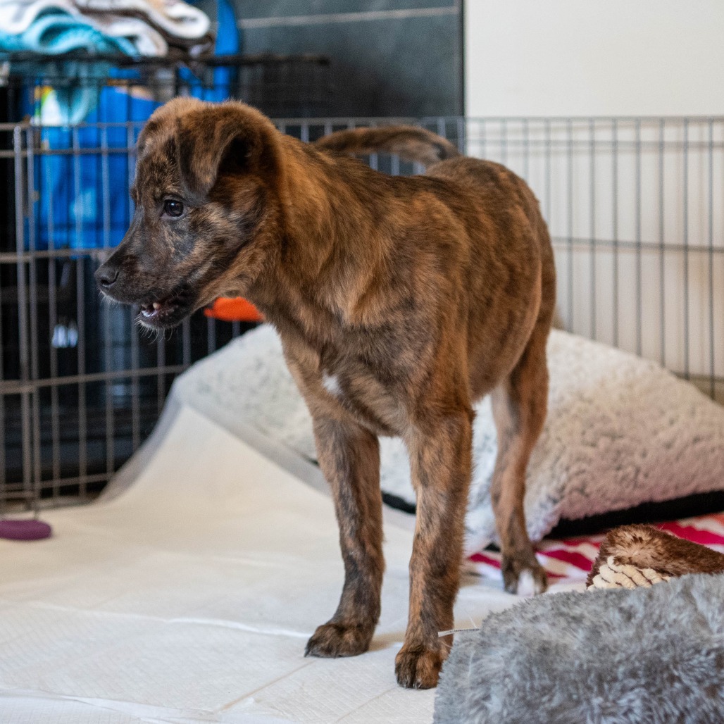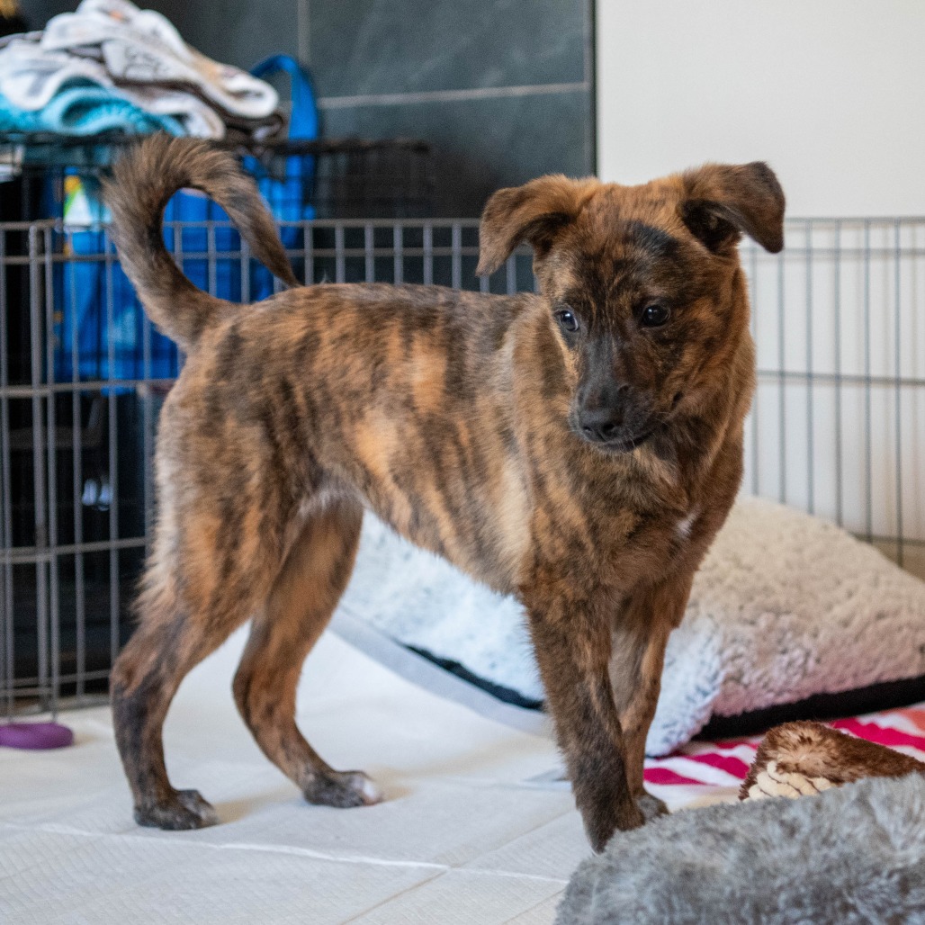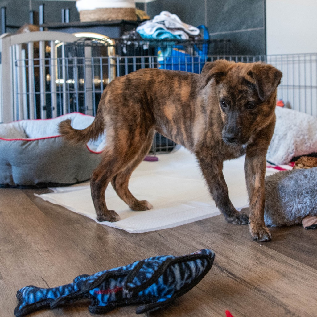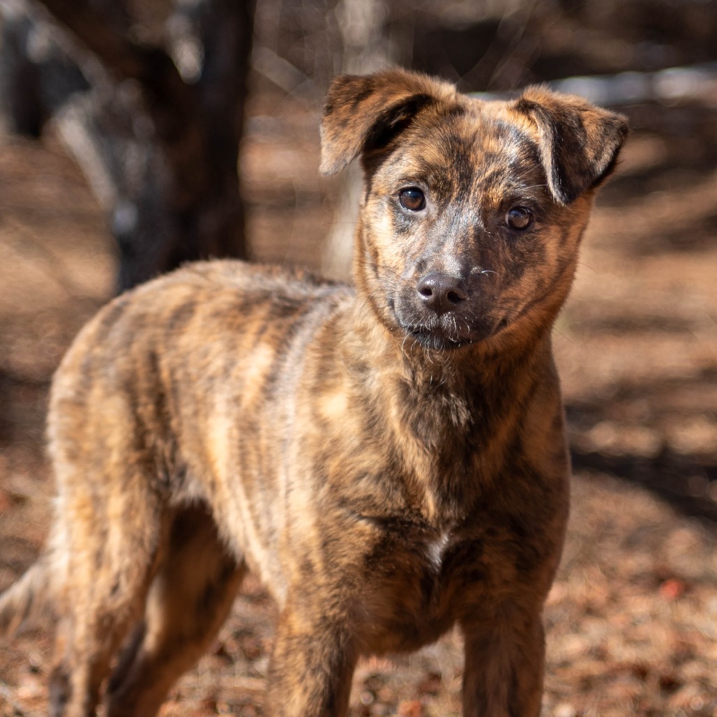 Eos is a loving and affectionate puppy who enjoys being close to her people, but she also loves playing with other dogs. A home with a calm, friendly resident dog would be especially beneficial, as another dog can help provide confidence, companionship, and help them learn the rhythms of the household.