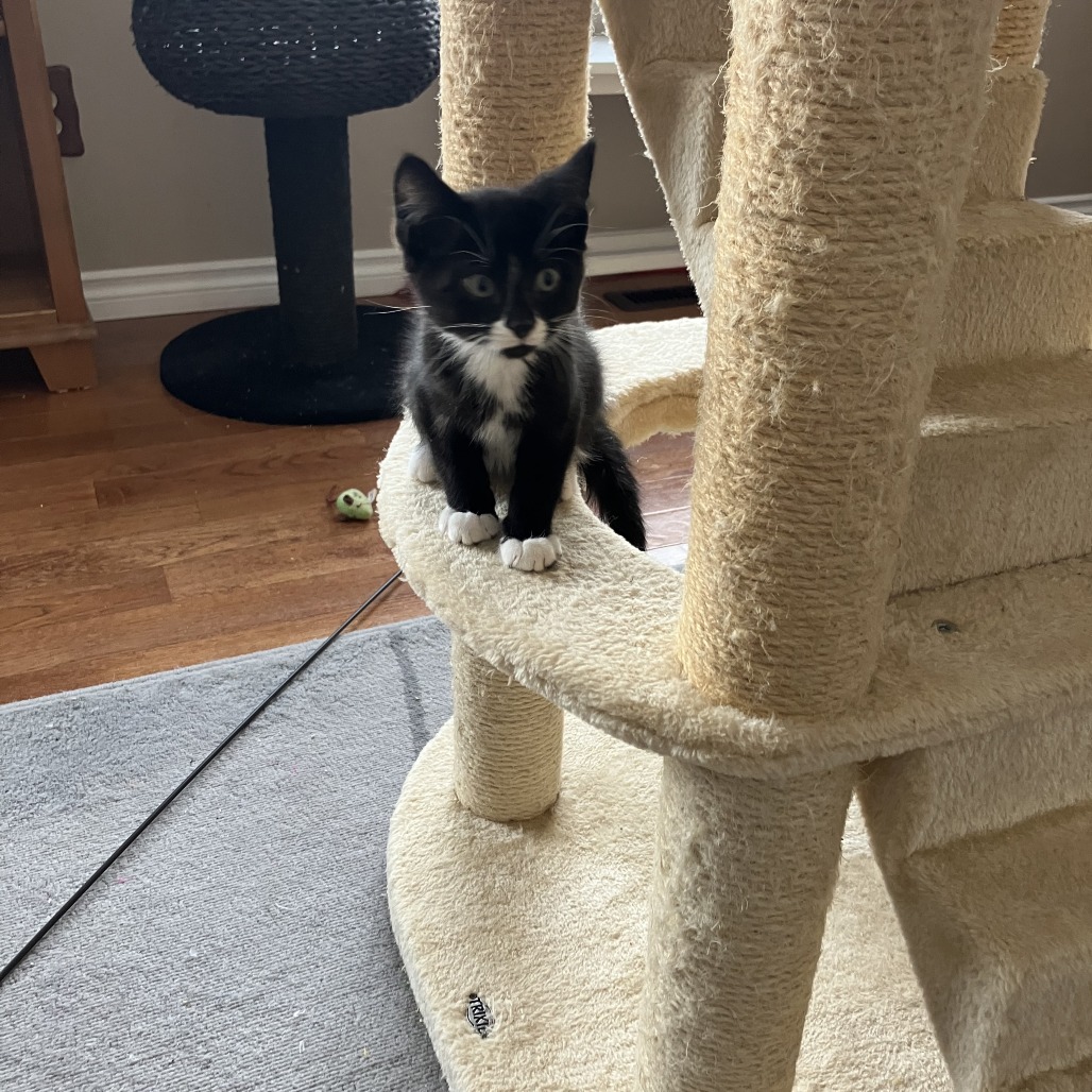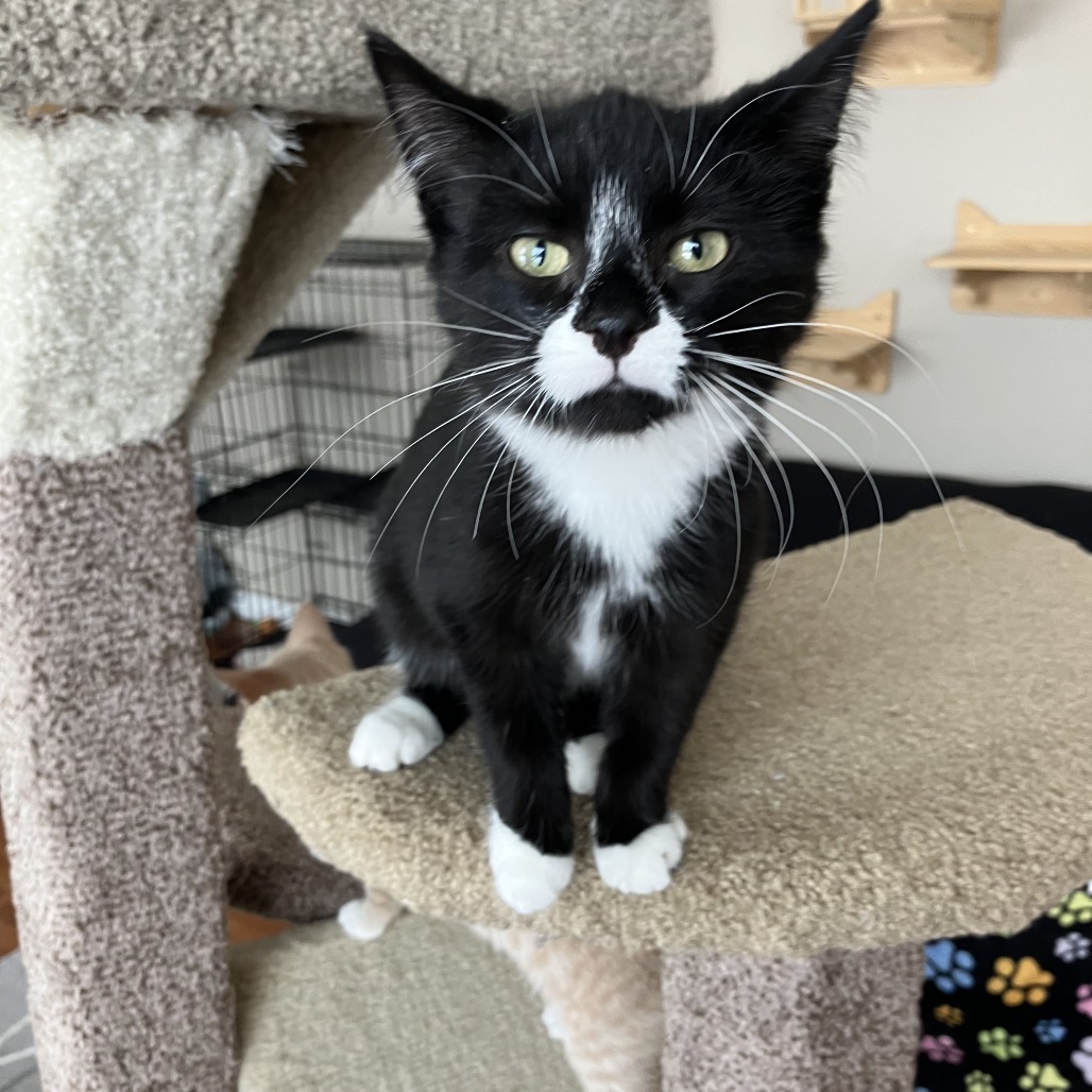 My name is Monet. I am a gentle little tuxedo male. I love to do all the kitten things like play and nap. I am very friendly with humans of all sizes. I have no issues with the litter box. I hope to meet you soon.