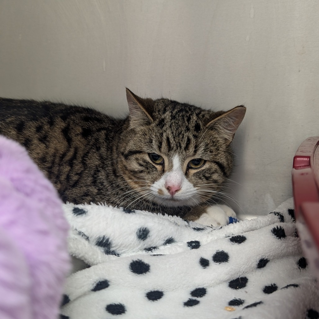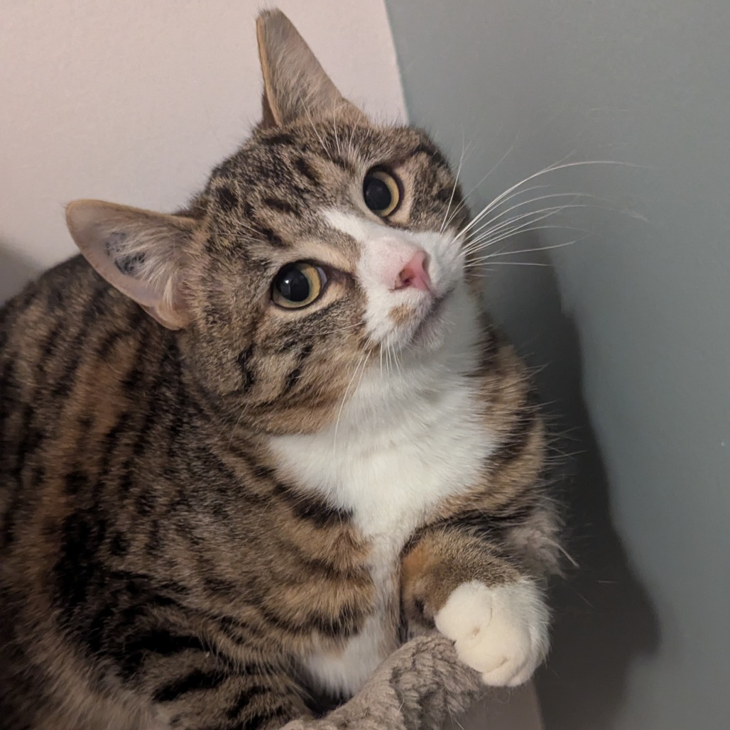 Hi, I'm Barton! I'm a pretty laid-back cat, but I can be a bit timid when I first meet you. When I first got to my foster home, I was so scared! But now two months later, I am a huge lovebug. You can hear me purring from across the room! I love to rub up against you to get pets. I can still get a bit startled by loud noises or sudden movements, so I don't think I'd be a good fit for a family with young children or excited dogs. Calm, confident cats and dogs would be okay though, and older children who are respectful of cats are also fine! My ideal family would also help get me to a healthy weight, as I am a little bit pudgy. If you're looking for an adult kitty that just needs some patience and love, please consider adopting me!