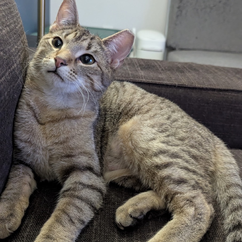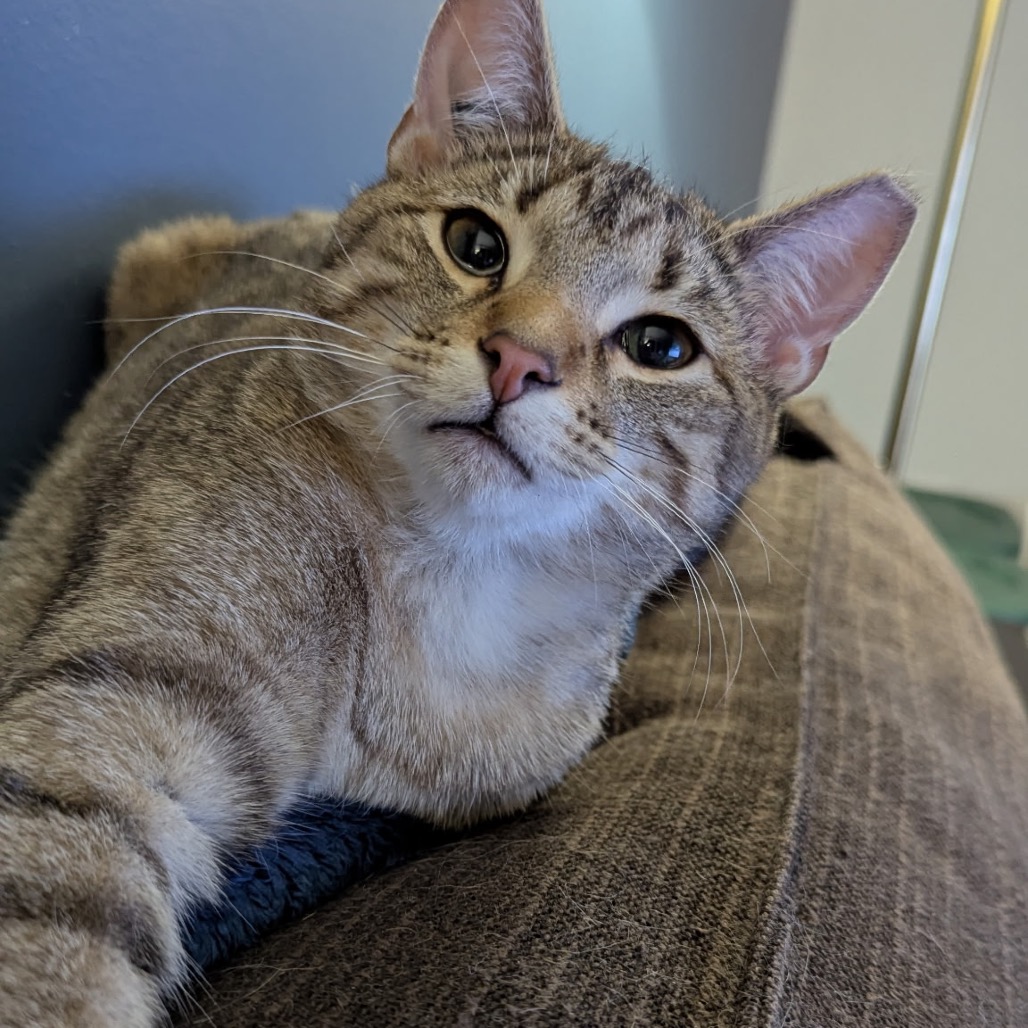 Hi, I'm Ventura! When I first came to SCARS, they thought I was a girl! Probably because I am super pretty. I was very scared when I first got to my foster home, but after lots of patience from my foster mom, I am much more confident now and love to get pets. I am still a little bit confused by love and sometimes (gently) bite foster mom's fingers, but I am just learning. I am also still pretty timid and am startled easily, but I am getting braver every day! I would prefer a home with no young children, but older kids and calm, confident cats or dogs would be okay. As long as you respect my space when I need it, I'll be happy! I need a family that will continue to help me grow more confident. Foster mom thinks that when I'm more comfortable, I might end up being pretty playful! If you're looking for an adult kitty that still needs some patience and love, please consider adopting me!