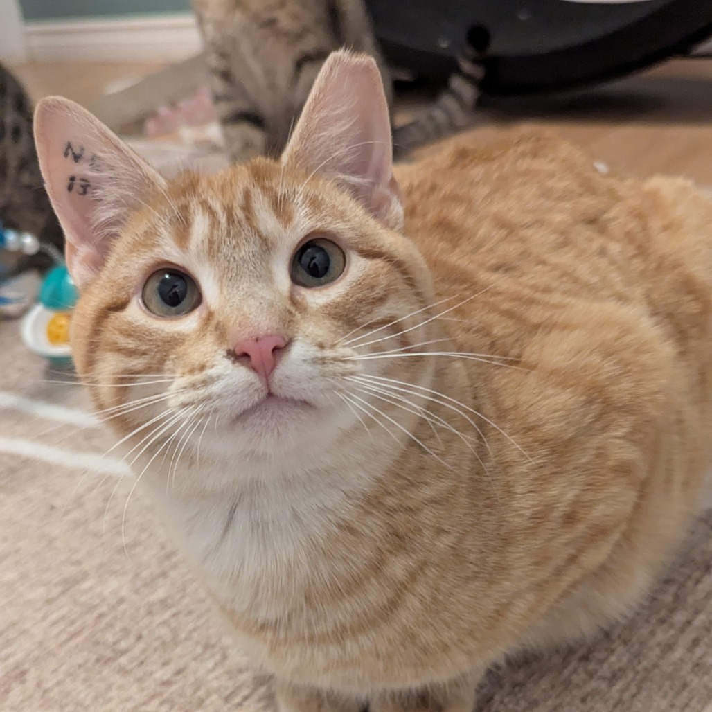 Hi, I'm Turnip! I'm a super sweet boy looking for a quiet home. I can be a bit nervous and shy when I first meet you, but once I'm comfortable I become a little lovebug! I love pets and I give great headbutts. I don't know if I'd like young kids as I get startled by sudden movements and loud noises, but cat-savvy older kids would be fine. I'm fine with other cats and I don't mind dogs as long as they respect my space. My perfect home would be quiet most of the time but also work on teaching me that loud noises and sudden movements don't have to be scary! I also want my new home to help me get to a healthy weight because I am a little bit pudgy! Please consider adopting me if you are looking for a grown up kitty who will blossom with a little patience and lots of love!