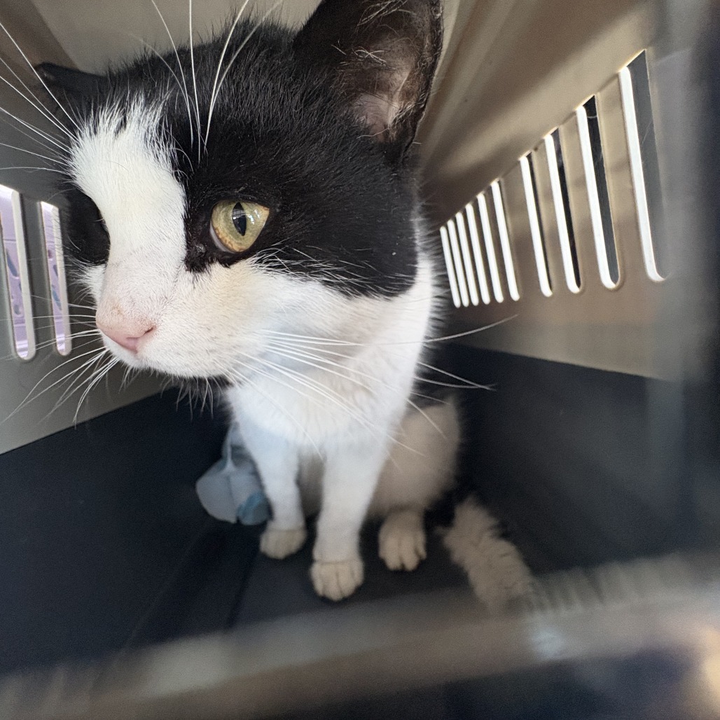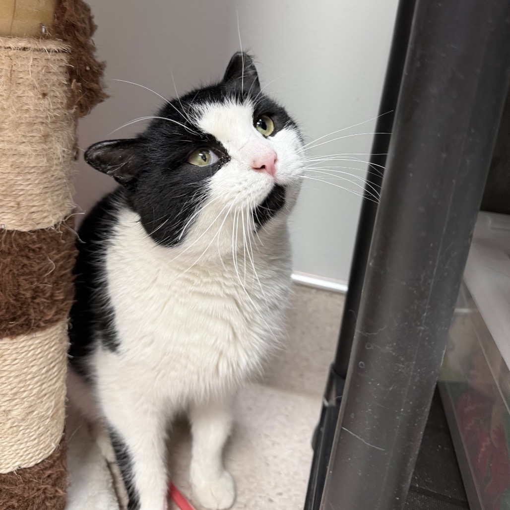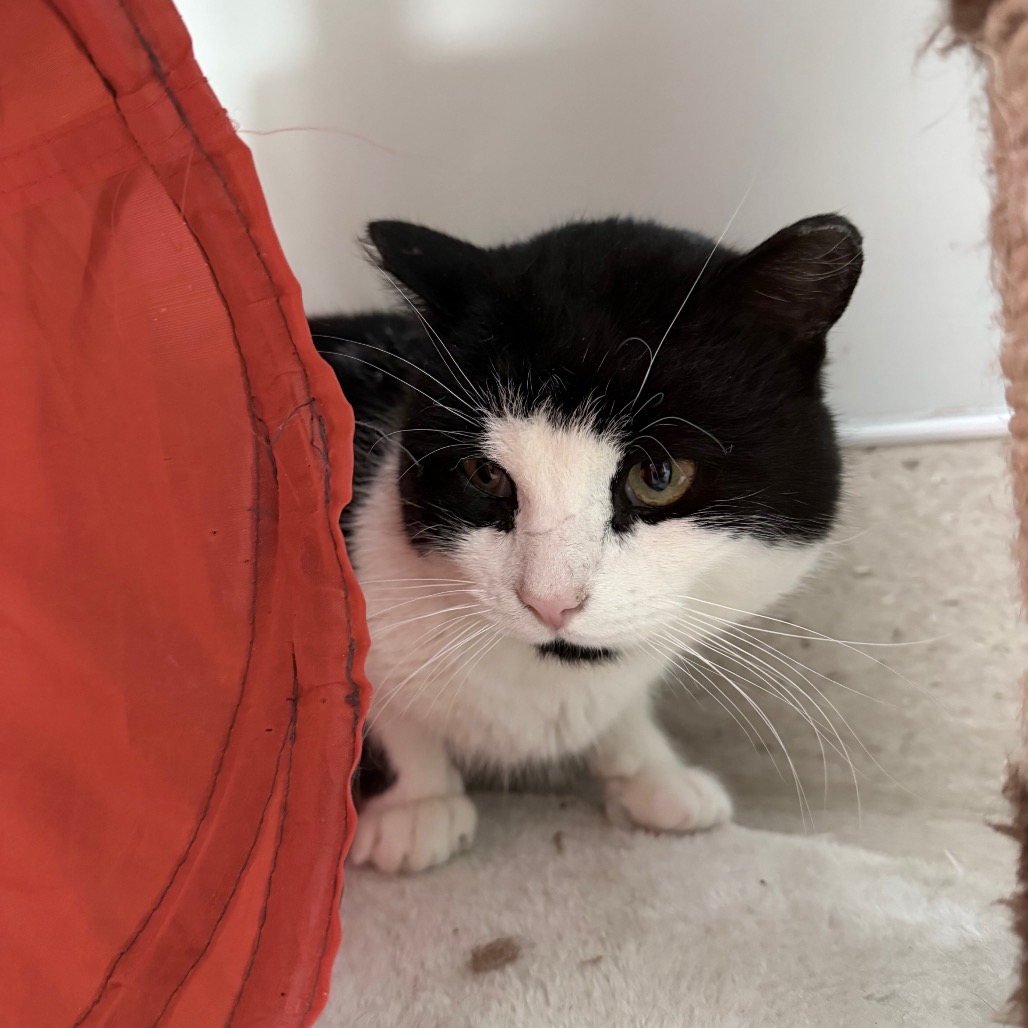 Dutchie is a striking tuxedo boy with lots of charm and a big personality. He enjoys gentle pets and quiet companionship, but he’s the type who likes affection on his terms. When he’s had enough, he’s not shy about letting you know with a gentle slap - so it’s important to read his signals and respect his space.