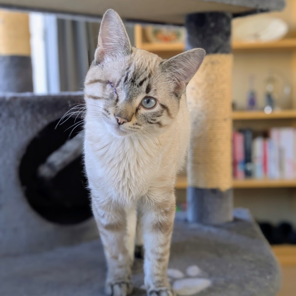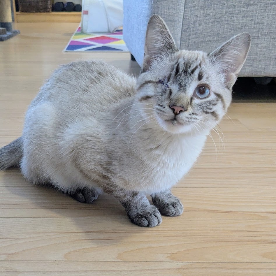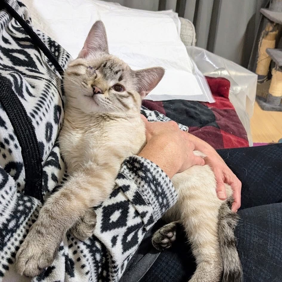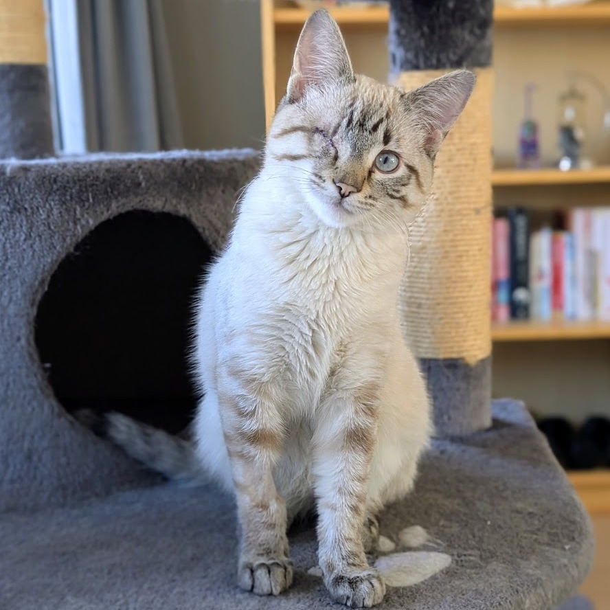 Hello, my name is Buck! As you can see, I have stunning good looks, but there's much more to me than that. I'm super sociable and love human company and cuddles. I purr a lot and chat a little. I'm very curious, which can get me in mischief as I must check out everything that's going on and will insert myself into any activity you're doing. As a young energetic chap, I'd do best with a friendly playful cat or dog in the home to chase around with and keep me entertained. Or someone who'll spend lots of time playing with me. I have just one eye, but that doesn't bother me in the least. I'm tidy in the litter box, and trimming my nails is a piece of cake. I had a seizure while in foster care, likely caused by the head trauma that led to the loss of my eye. I take half a tablet of meds twice a day in a spoonful of wet food, and wolf it down like a champ. I've had no further seizures since being on my medication. Foster mom can answer any questions and make sure you have all the info you need about my care. So, shall we snuggle?