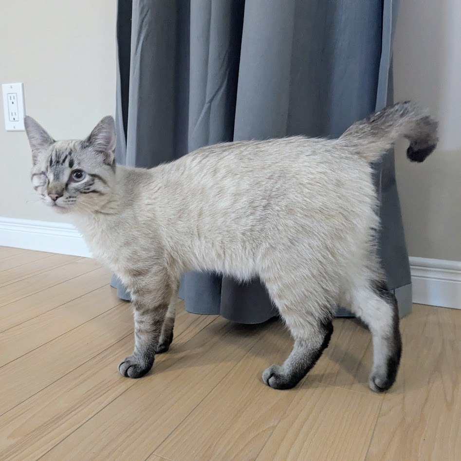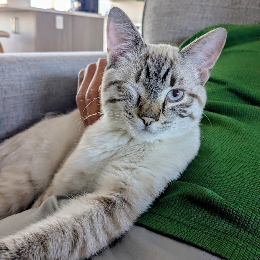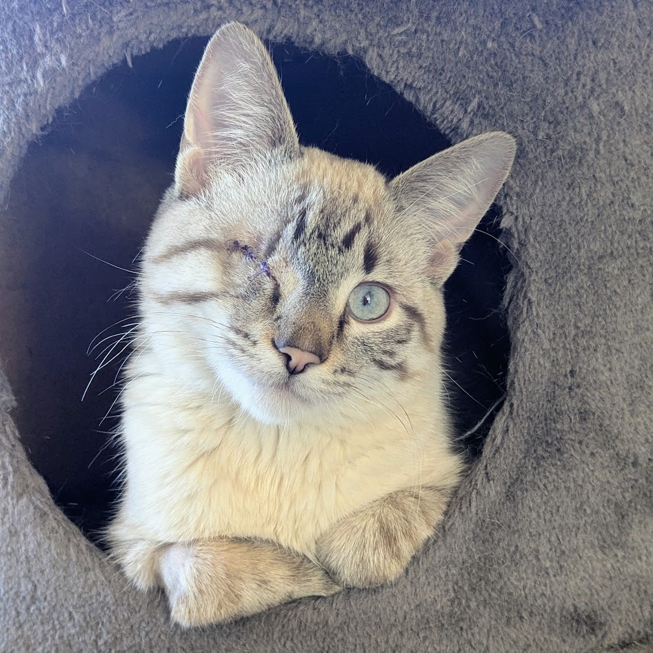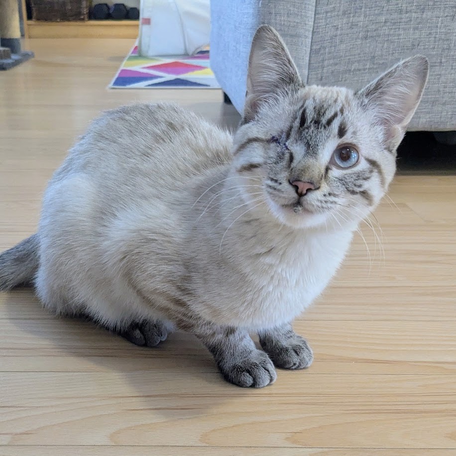 Hello, my name is Buck! As you can see, I have stunning good looks, but there's much more to me than that. I'm super sociable and love human company and cuddles. I purr a lot and chat a little. I'm very curious, which can get me in mischief as I must check out everything that's going on and will insert myself into any activity you're doing. As a young energetic chap, I'd do best with a friendly playful cat or dog in the home to chase around with and keep me entertained. Or someone who'll spend lots of time playing with me. I have just one eye, but that doesn't bother me in the least. I'm tidy in the litter box, and trimming my nails is a piece of cake. I had a seizure while in foster care, likely caused by the head trauma that led to the loss of my eye. I take half a tablet of meds twice a day in a spoonful of wet food, and wolf it down like a champ. I've had no further seizures since being on my medication. Foster mom can answer any questions and make sure you have all the info you need about my care. So, shall we snuggle?