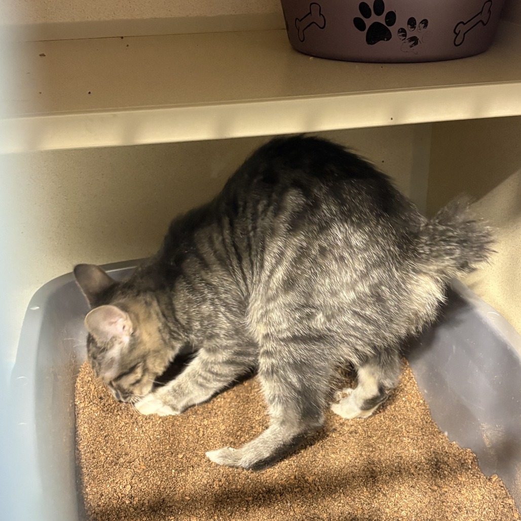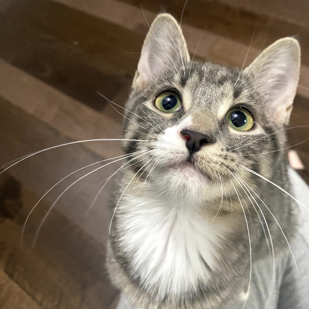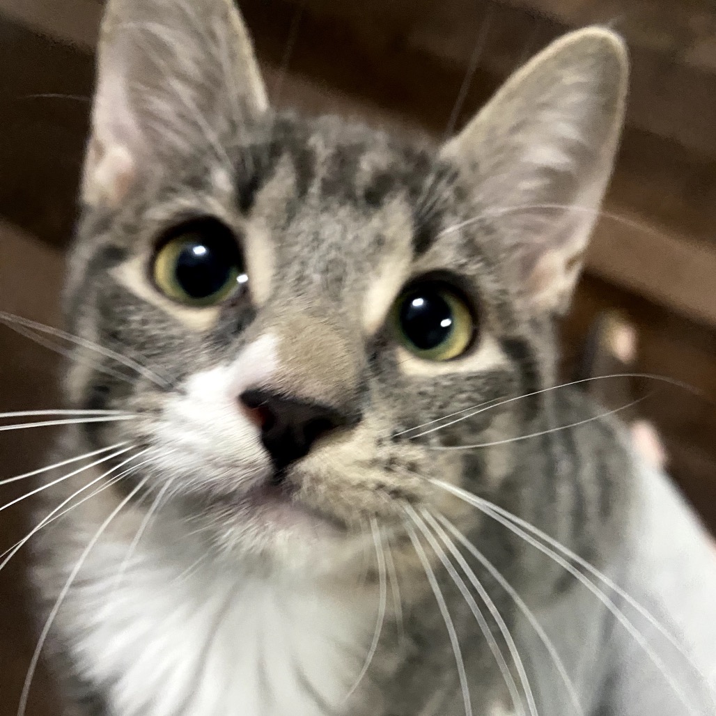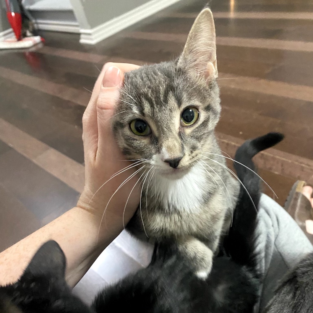 Hi, my name is Sushi! I came into care with my mom and siblings back in January and am ready for my forever home. I'm the only one in our litter with a little bobtail like our mom. I'm very energetic and boisterous and spend lots of time every day racing around, playing with toys, and wrestling with my siblings. I would do well in a home with another playful young cat, or plenty of people to take turns running off all this energy. I'm a little unique in that I use my teeth a lot - my foster home thinks it's a combination of teething, comfort (I'll sometimes lightly hold on and fall asleep), and my previous people teaching me that it's fun to play with hands. The gentle comfort nipping is ok, but I do need to work on the play biting and this would require my forever home to be consistent in reinforcing that this isn't very fun for the receiving end. Because of this, I would do better in a home with no/older kids. I'm a super social, cuddly, loving girl and will grow up into a great companion with a little extra training!