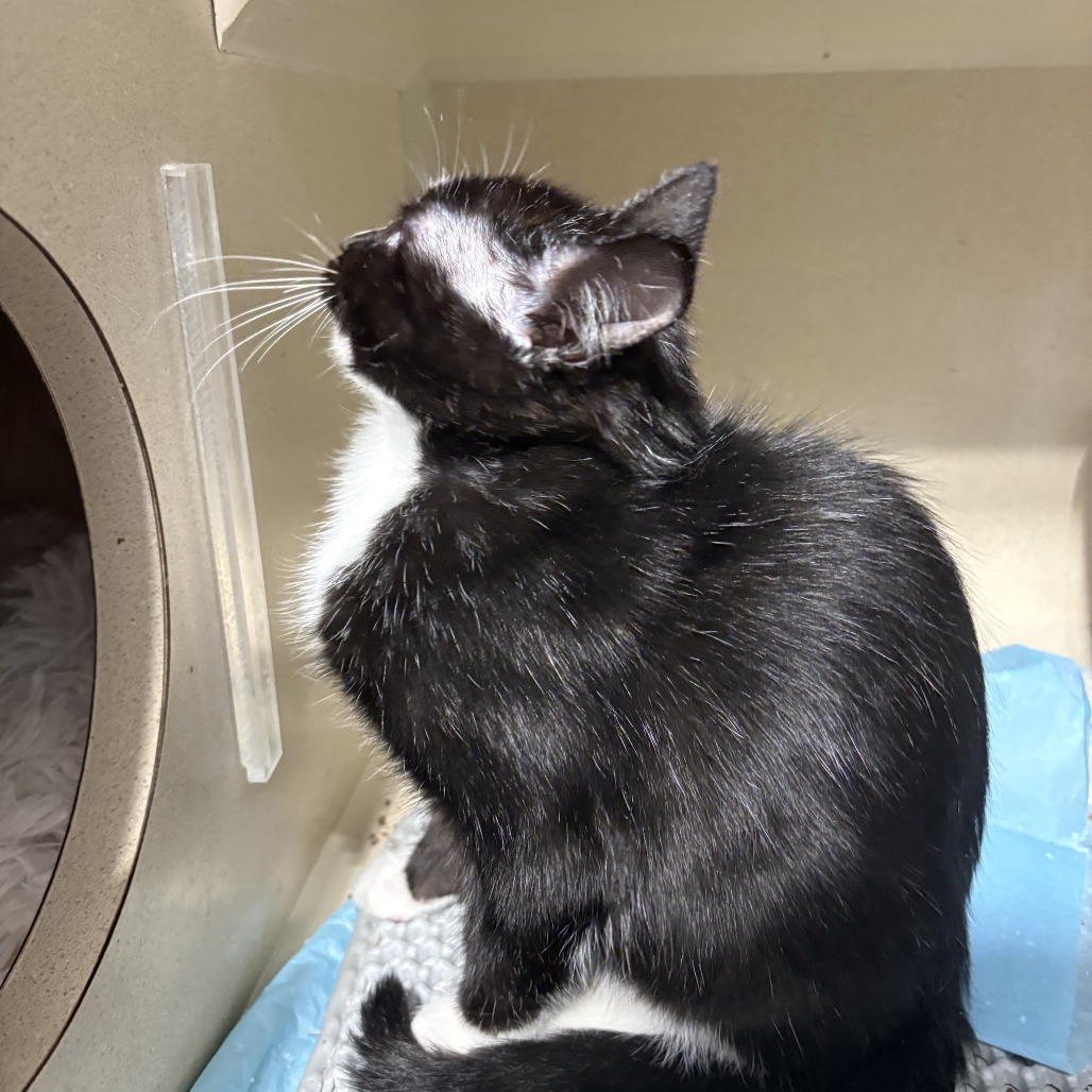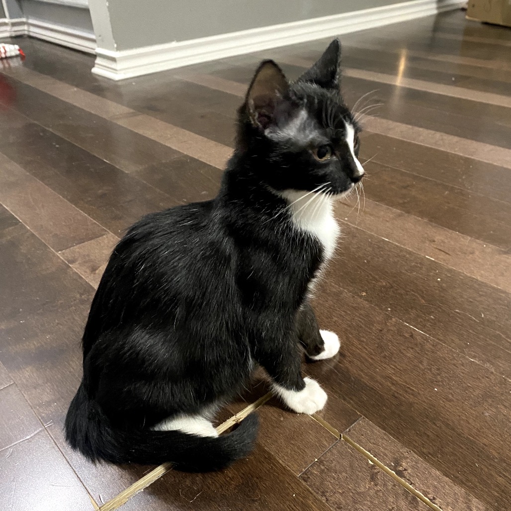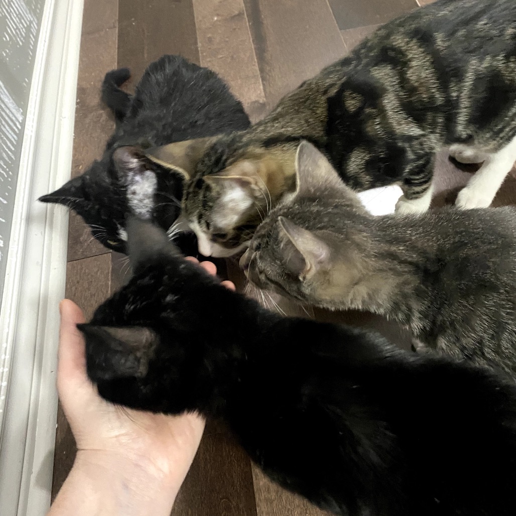 My name is Bento and I came to scars with my mom and siblings back in January. I'm the most playful kitten in our litter and love to chase after toys. I'm always on the go. I'm also nearly twice the weight of my other siblings, despite being shorter - my foster home says I remind them of a fat little potato. I'm getting cuddlier every day, and I really love chin scratches and having my belly rubbed. Even though I'm social, I came in very scared of everything and am still sensitive to high noise or energy levels, so I would prefer a quieter home without young kids, parties, etc. I do still love people, though, and really enjoy a good cuddle. I'm not as into playing with hands as my siblings are, but I would still benefit from consistent reinforcement that this kind of play isn't appreciated. I'll be a very sweet boy when I grow up!